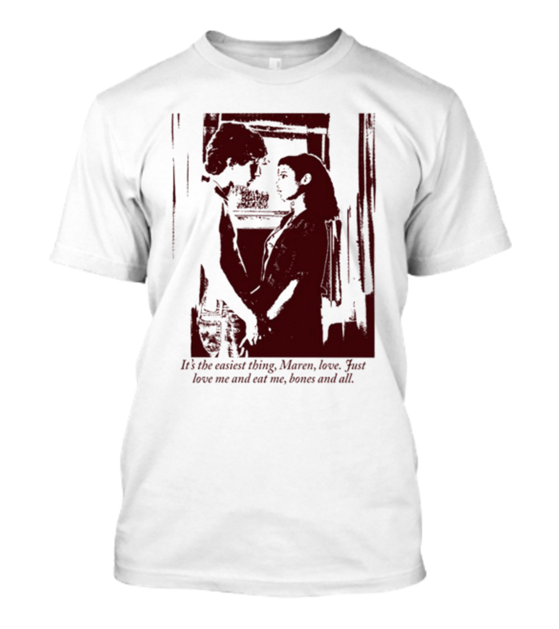 The It's The Easiest Thing Maren Love Just Love Me And Eat Me Bones And All Romantic Scene T-shirt is designed for everyday wear and a consistent fit. Fabric is pre-shrunk ring-spun cotton with durable stitching. See the size chart below for exact measurements.