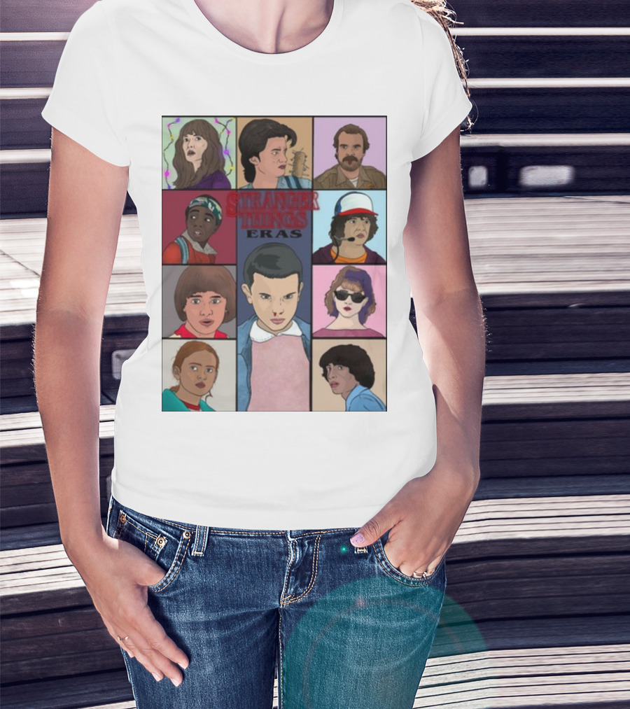 The Stranger Things Eras Character Collage T-shirt is designed for everyday wear and a consistent fit. Fabric is pre-shrunk ring-spun cotton with durable stitching. See the size chart below for exact measurements.