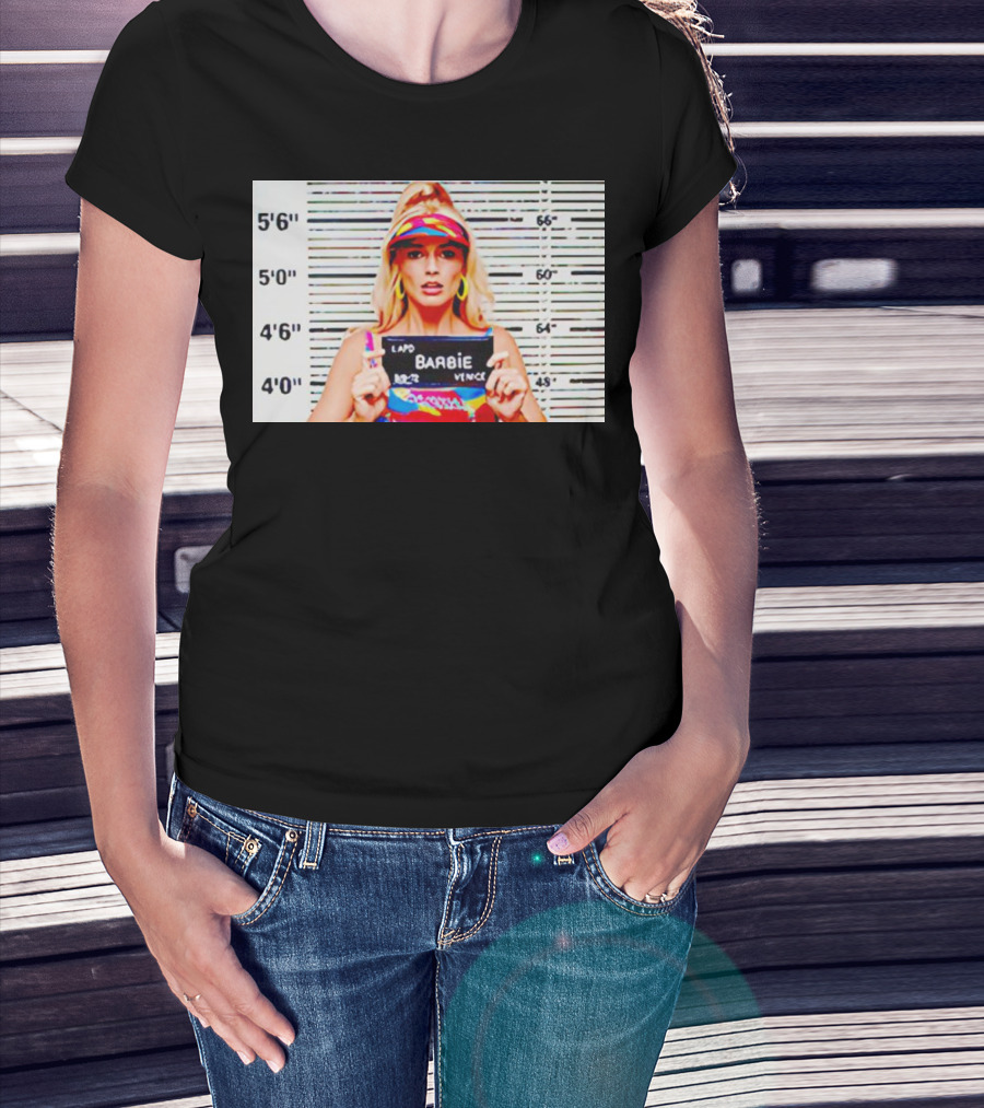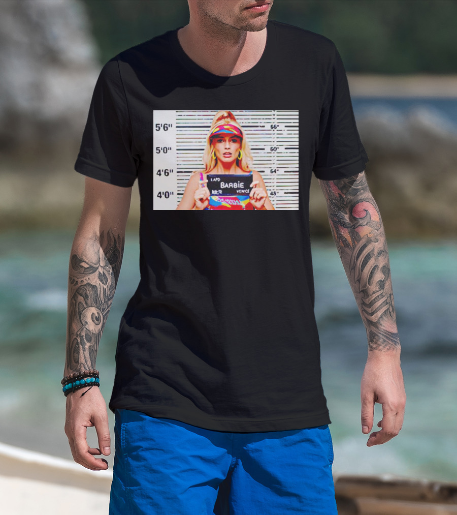 The LAPD Barbie Mugshot Colorful T-shirt is designed for everyday wear and a consistent fit. Fabric is pre-shrunk ring-spun cotton with durable stitching. See the size chart below for exact measurements.