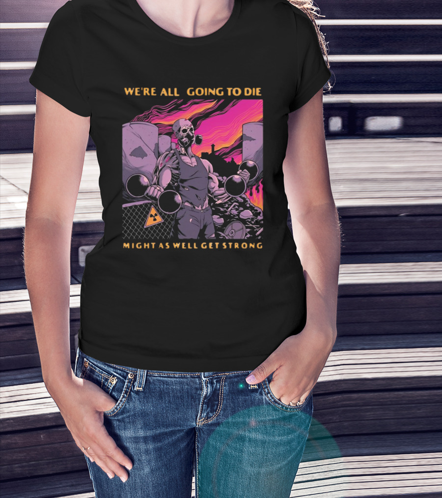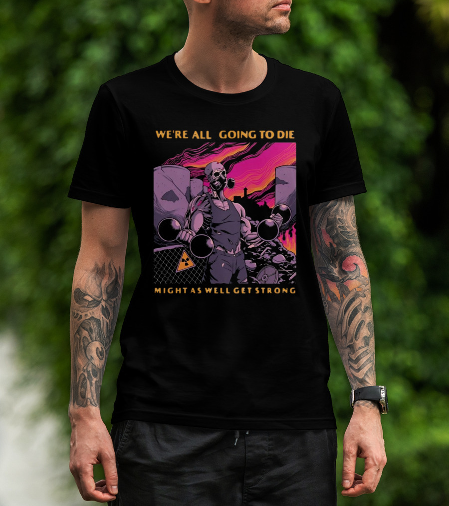 Raskolapparel We're All Going To Die Might As Well Get Strong Gas Mask Bodybuilder Nuclear Wasteland Fitness Motivation T-Shirt