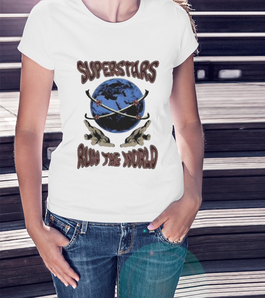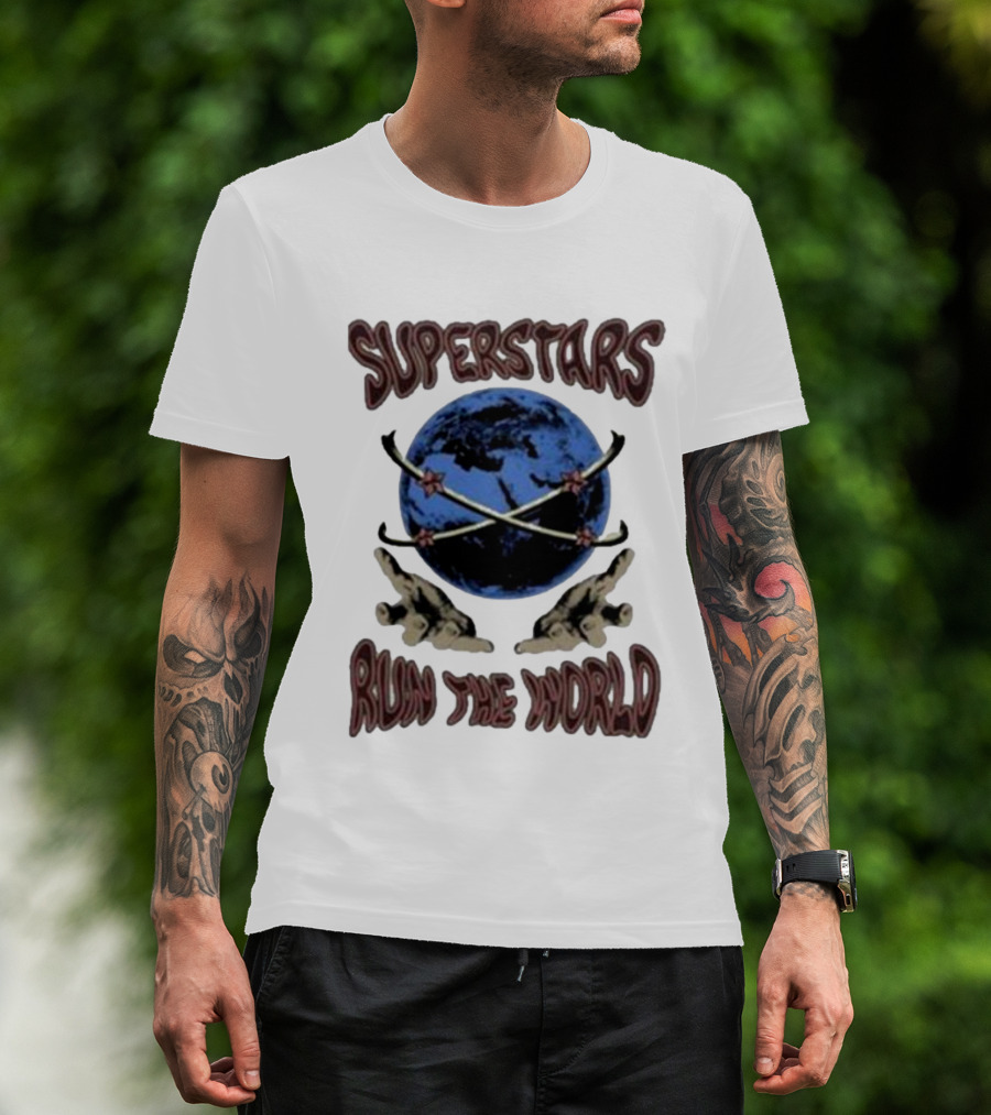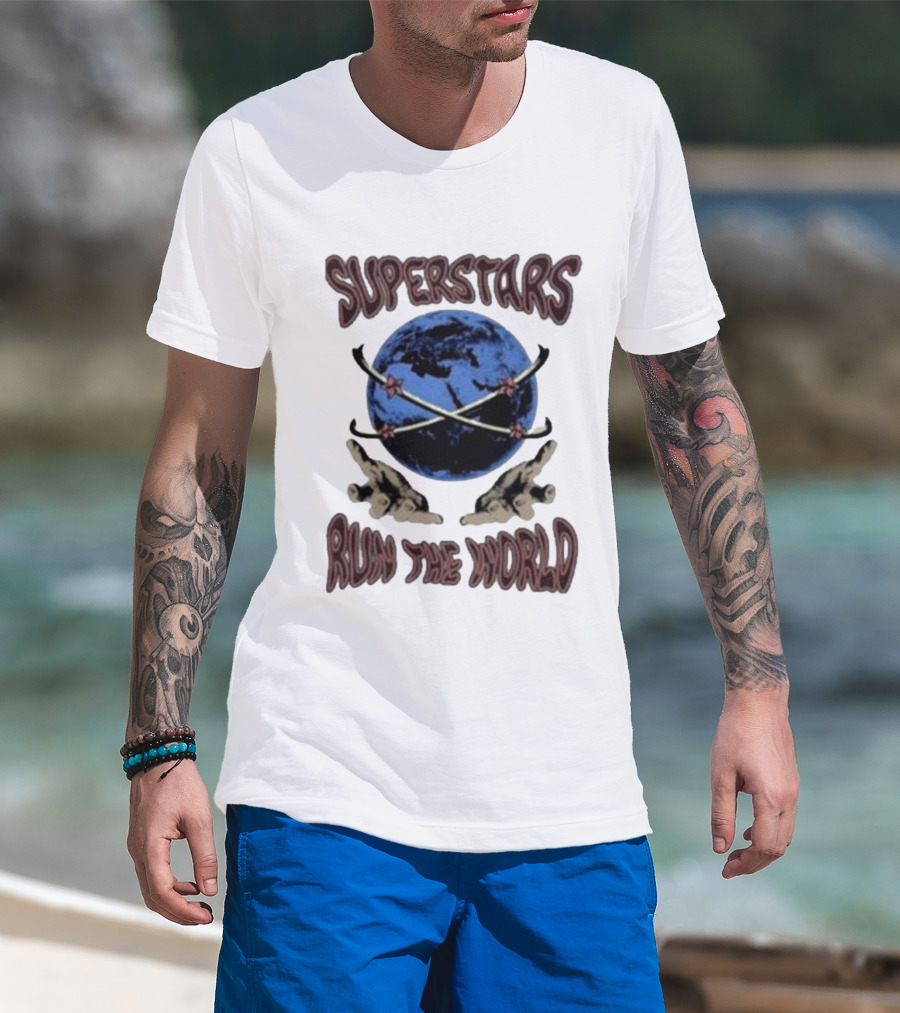 The Superstars Run the World Planet T-shirt is designed for everyday wear and a consistent fit. Fabric is pre-shrunk ring-spun cotton with durable stitching. See the size chart below for exact measurements.