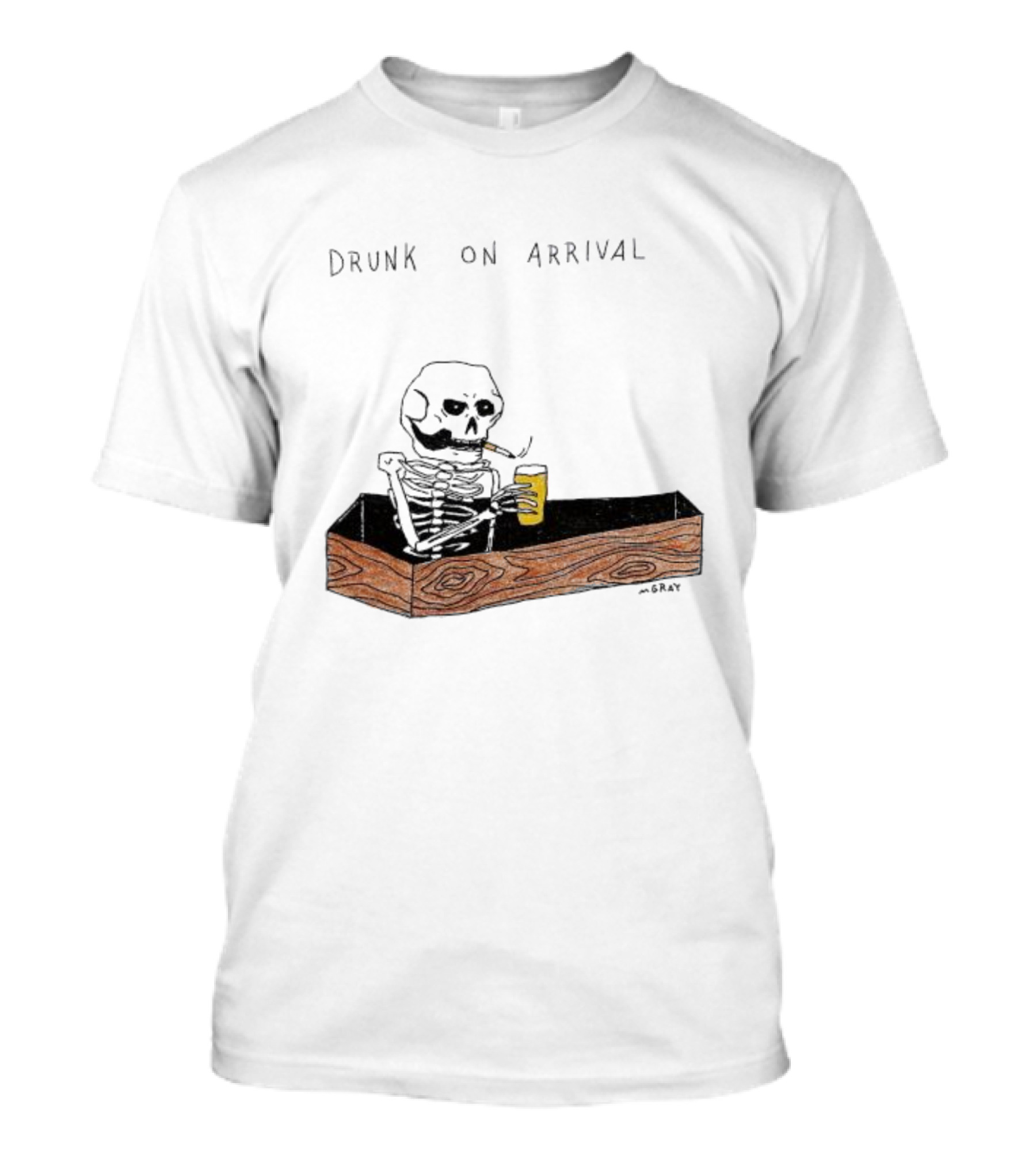 The Skeleton Drunk on Arrival Coffin Bar by M.Gray T-shirt is designed for everyday wear and a consistent fit. Fabric is pre-shrunk ring-spun cotton with durable stitching. See the size chart below for exact measurements.