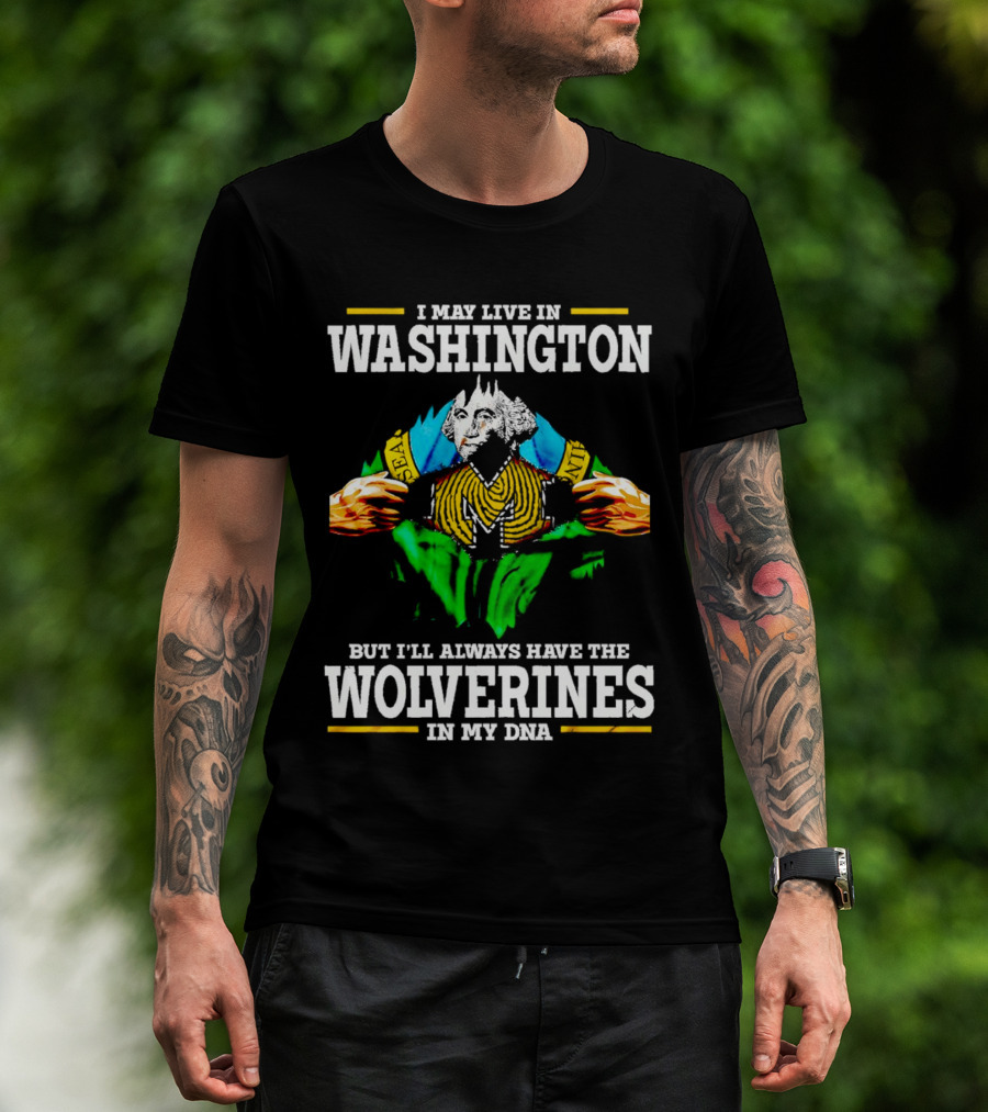 I May Live In Washington But I'll Always Have The Wolverines In My DNA With Image Of Muscular George Washington In Michigan Colors T-Shirt