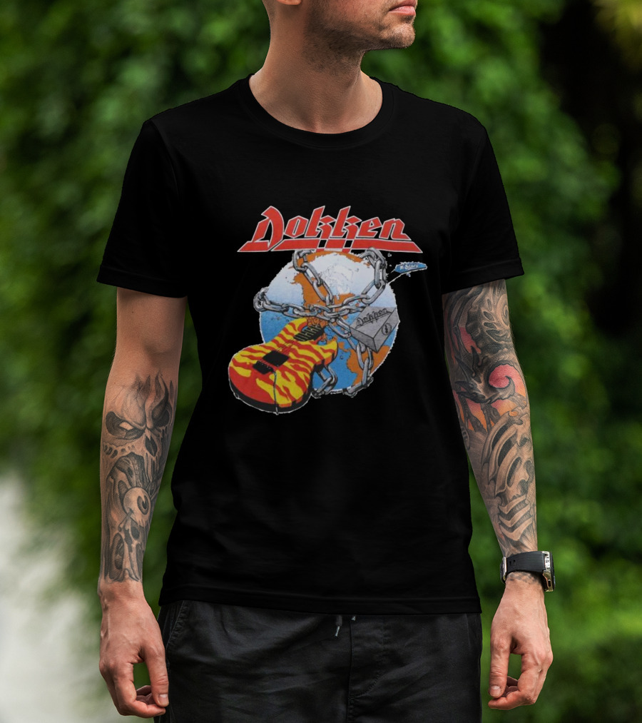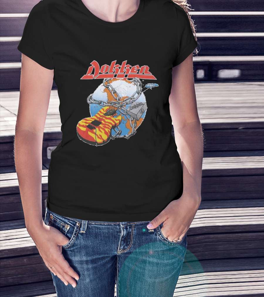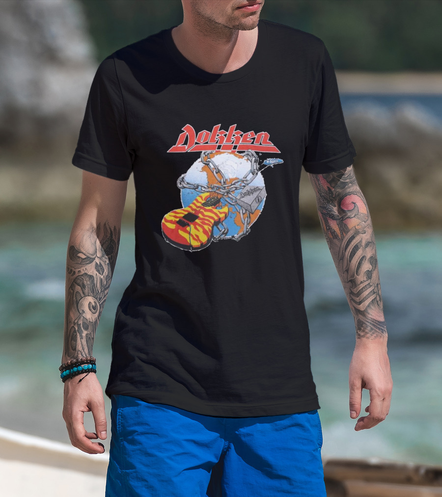The 1980s Dokken Rokken with Dokken Flaming Guitar Chained to Globe T-shirt is designed for everyday wear and a consistent fit. Fabric is pre-shrunk ring-spun cotton with durable stitching. See the size chart below for exact measurements.