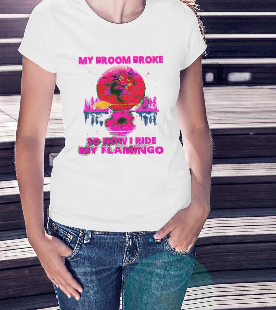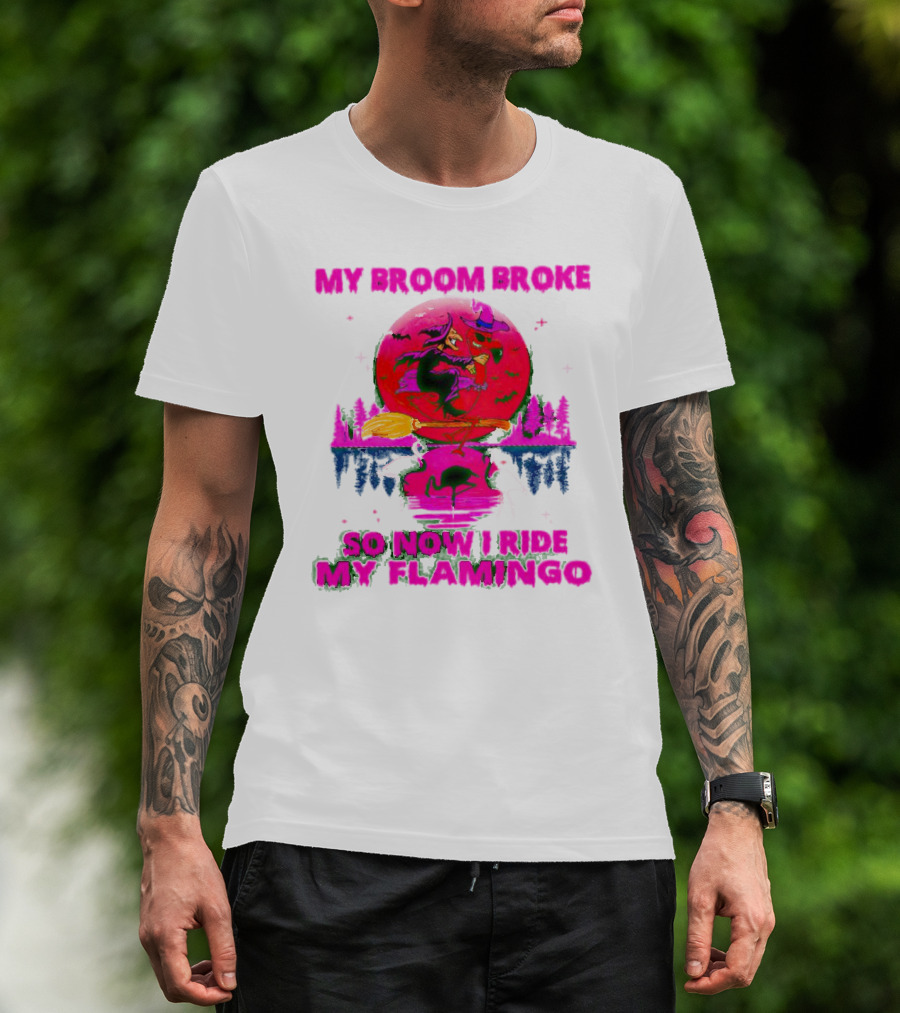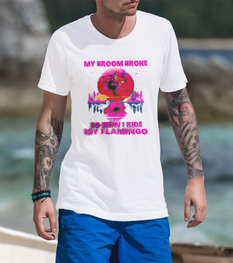 My Broom Broke So Now I Ride My Flamingo Neon Witch And Flamingo Moon Scene T-Shirt