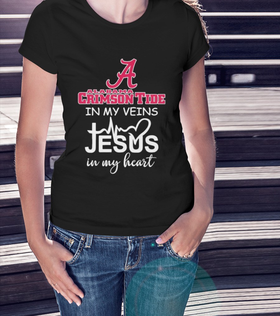 Alabama Crimson Tide A Logo In My Veins Jesus Heartbeat In My Heart T-Shirt