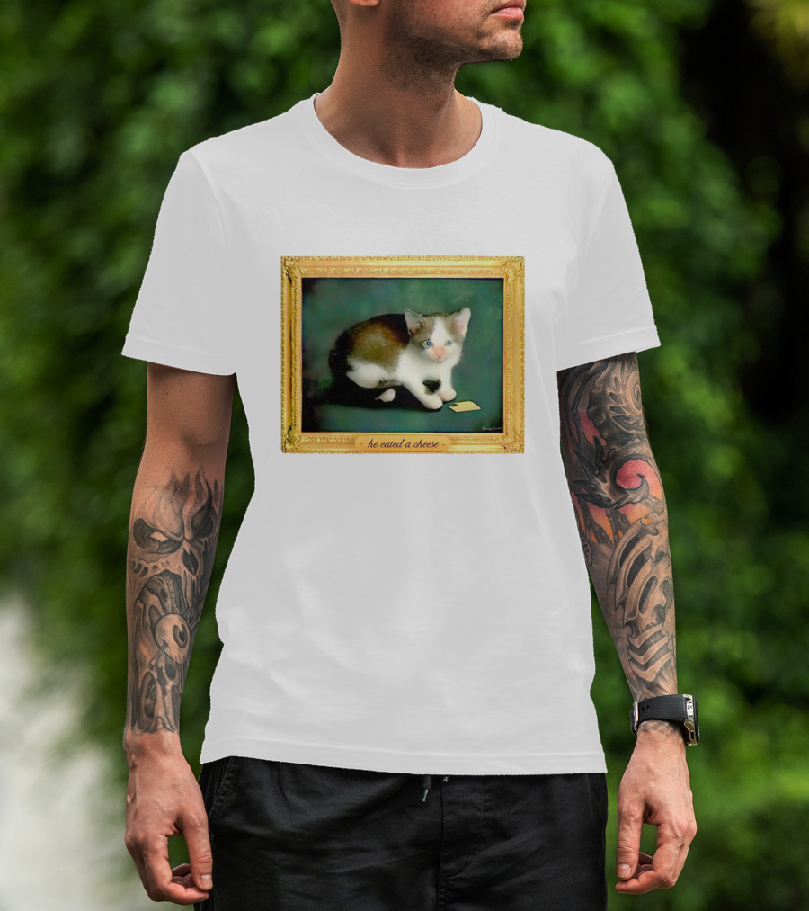 The Cat He Eated a Cheese Framed T-shirt is designed for everyday wear and a consistent fit. Fabric is pre-shrunk ring-spun cotton with durable stitching. See the size chart below for exact measurements.