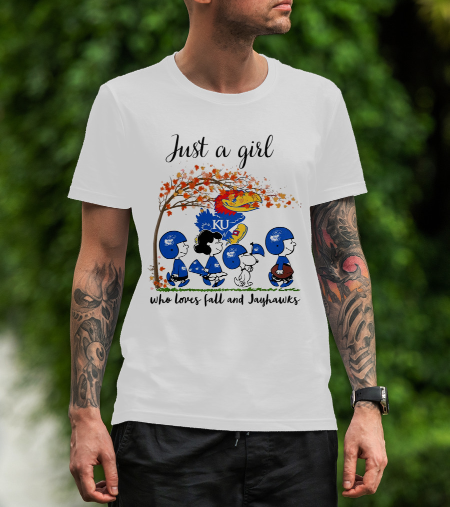 Just A Girl Who Loves Fall And Jayhawks Peanuts Cartoon Halloween KU T-Shirt