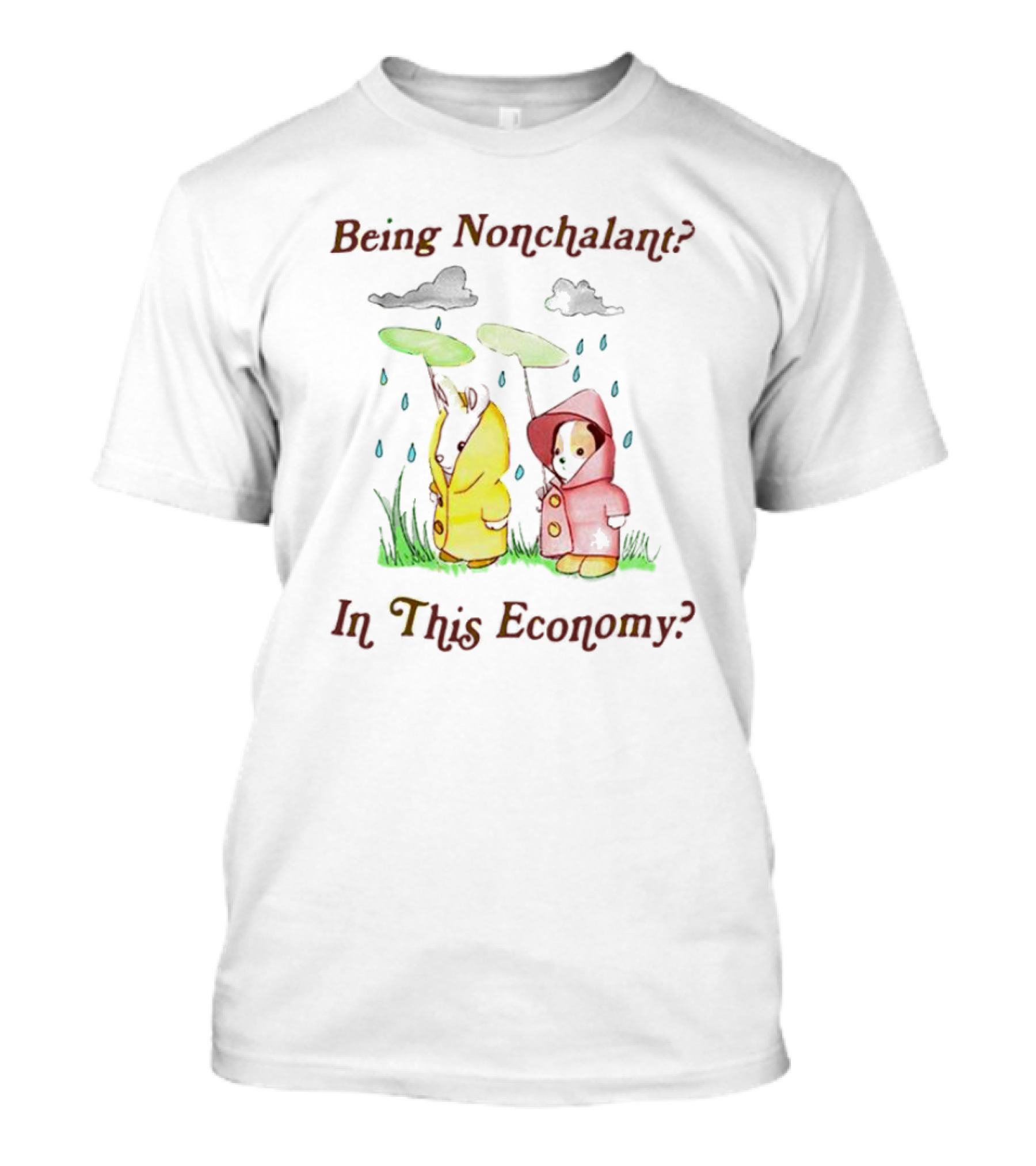 The Being Nonchalant in This Economy with Raindrop Penguins and Clouds T-shirt is designed for everyday wear and a consistent fit. Fabric is pre-shrunk ring-spun cotton with durable stitching. See the size chart below for exact measurements.
