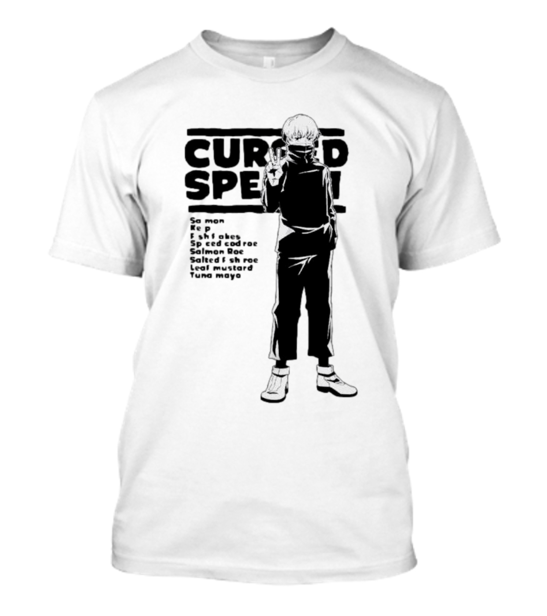 The Cursed Speech Jujutsu Kaisen Toge Inumaki Sa Mon Shake Salmon Roe Tuna Mayo T-shirt is designed for everyday wear and a consistent fit. Fabric is pre-shrunk ring-spun cotton with durable stitching. See the size chart below for exact measurements.