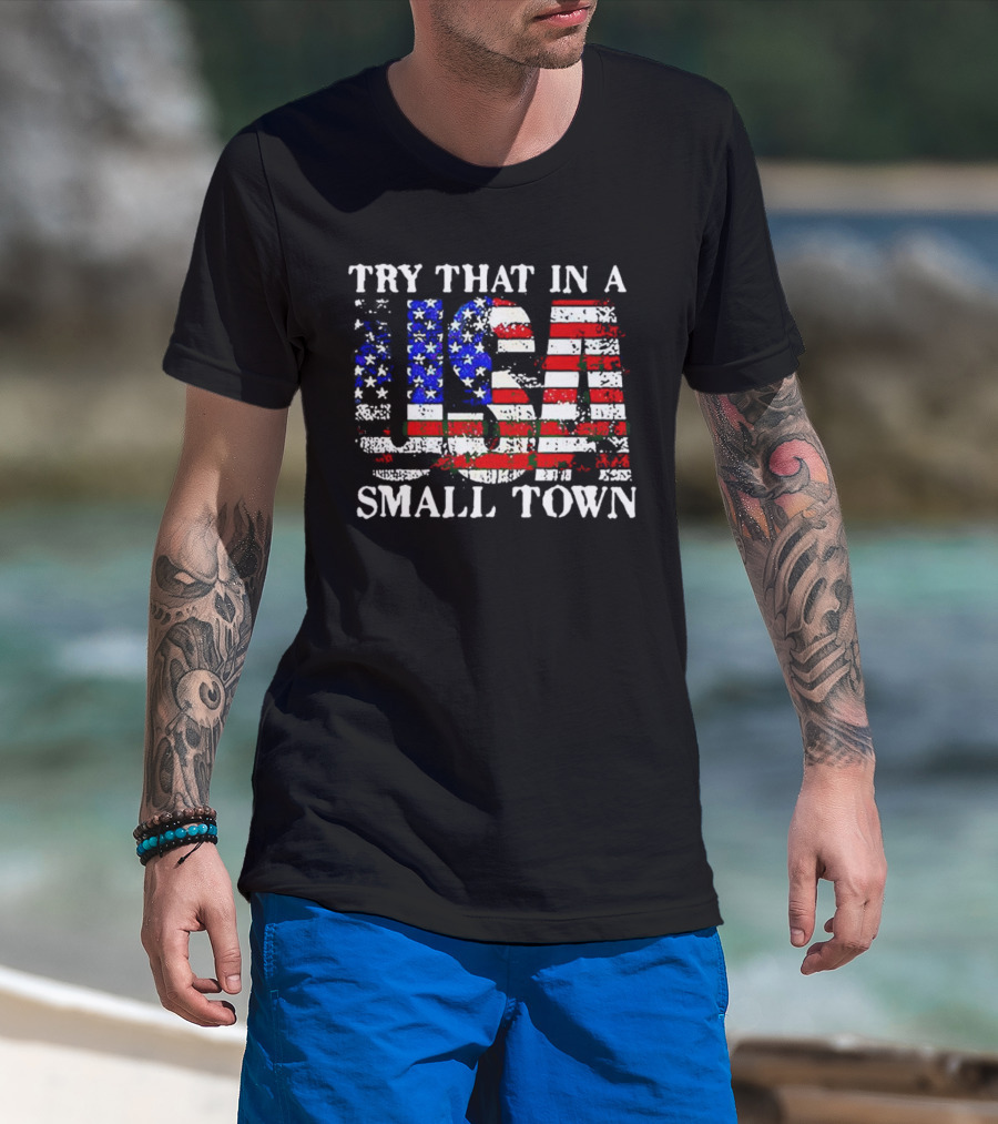 The Try That in a USA Small Town American Flag T-shirt is designed for everyday wear and a consistent fit. Fabric is pre-shrunk ring-spun cotton with durable stitching. See the size chart below for exact measurements.