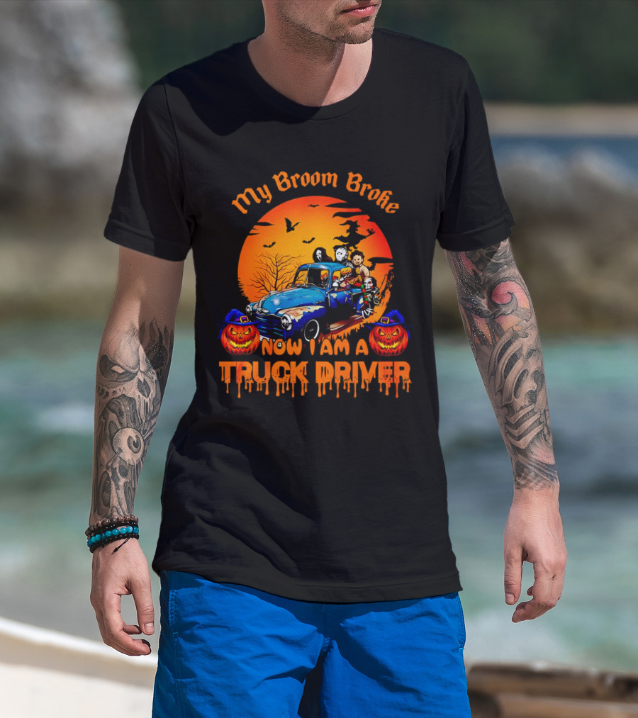 My Broom Broke Now I Am A Truck Driver Halloween Truck With Pumpkins And Ghosts T-Shirt