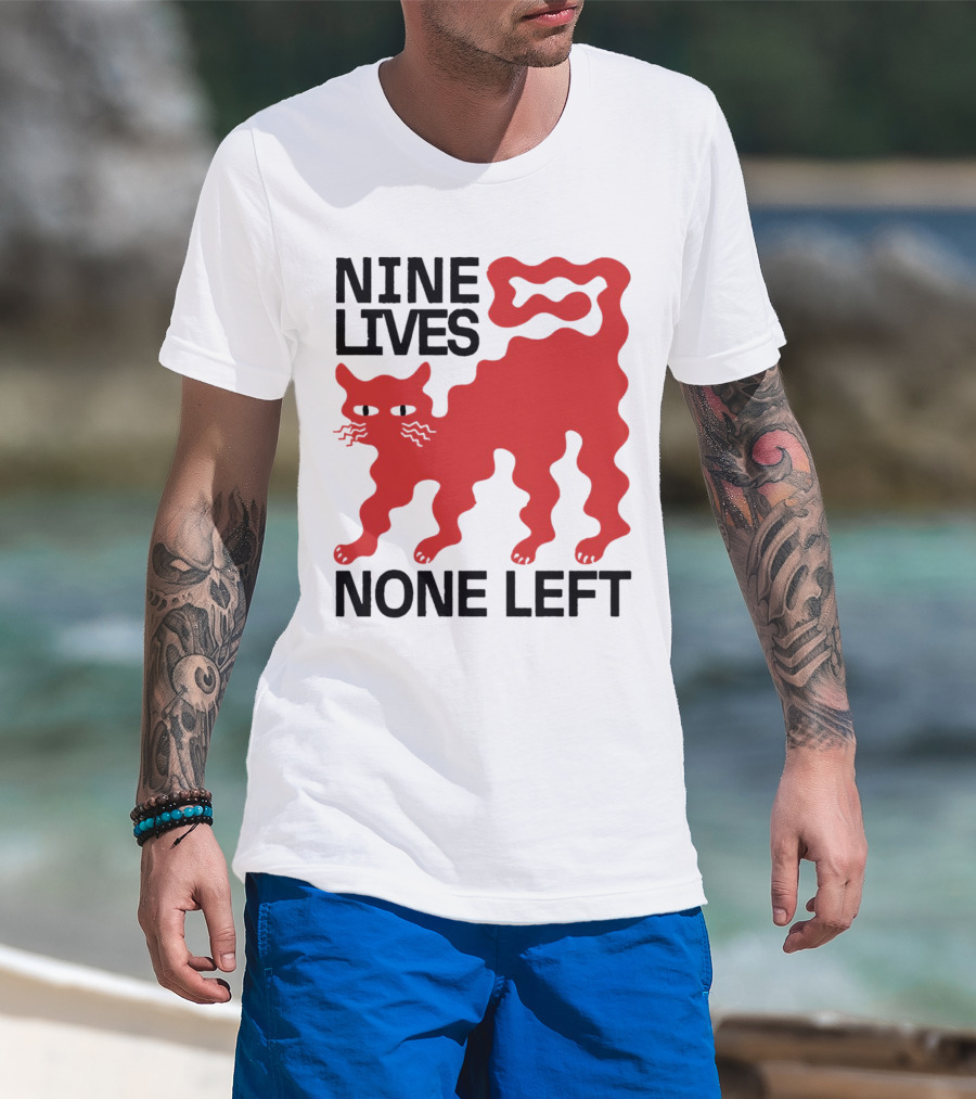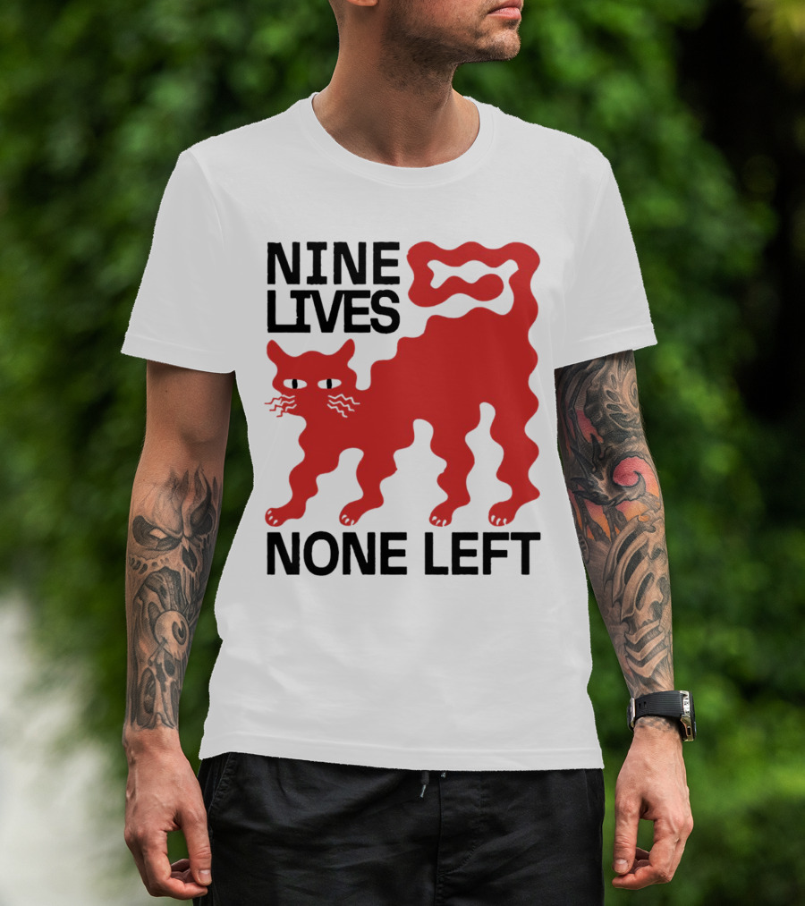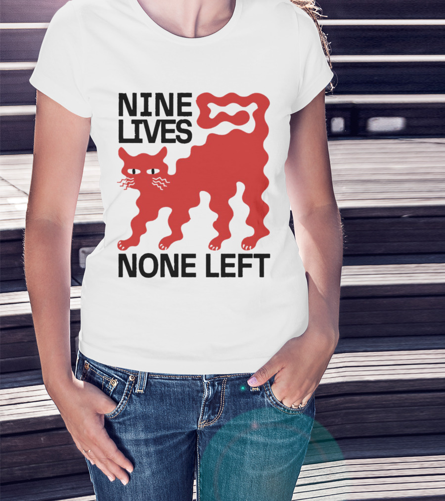 The Nine Lives None Left Red Cat T-shirt is designed for everyday wear and a consistent fit. Fabric is pre-shrunk ring-spun cotton with durable stitching. See the size chart below for exact measurements.
