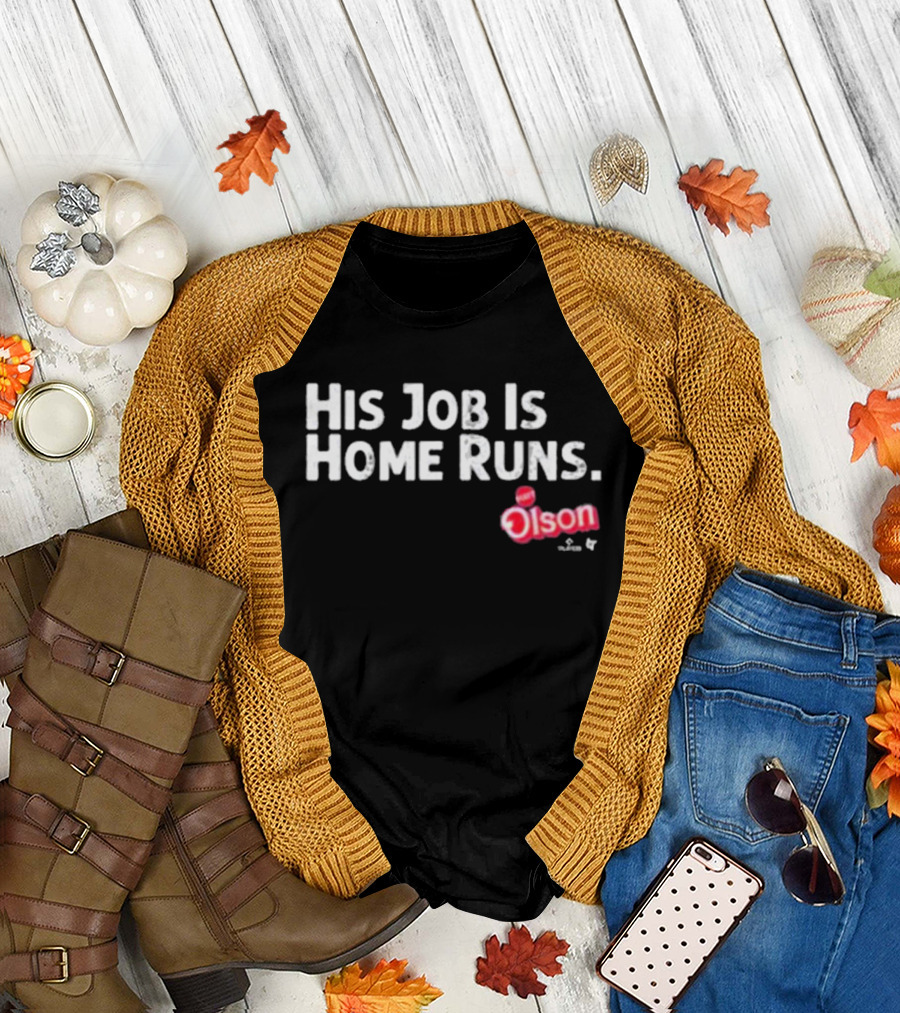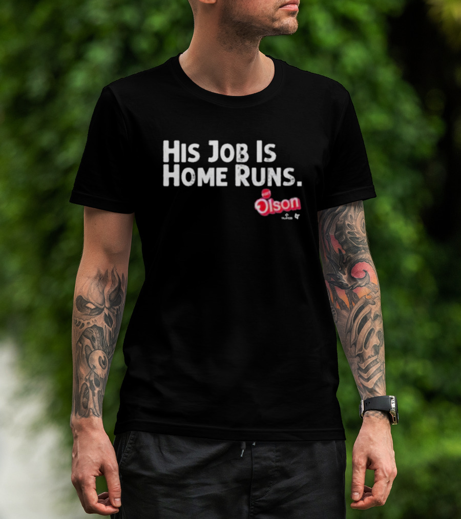 The His Job Is Home Runs Matt Olson T-shirt is designed for everyday wear and a consistent fit. Fabric is pre-shrunk ring-spun cotton with durable stitching. See the size chart below for exact measurements.