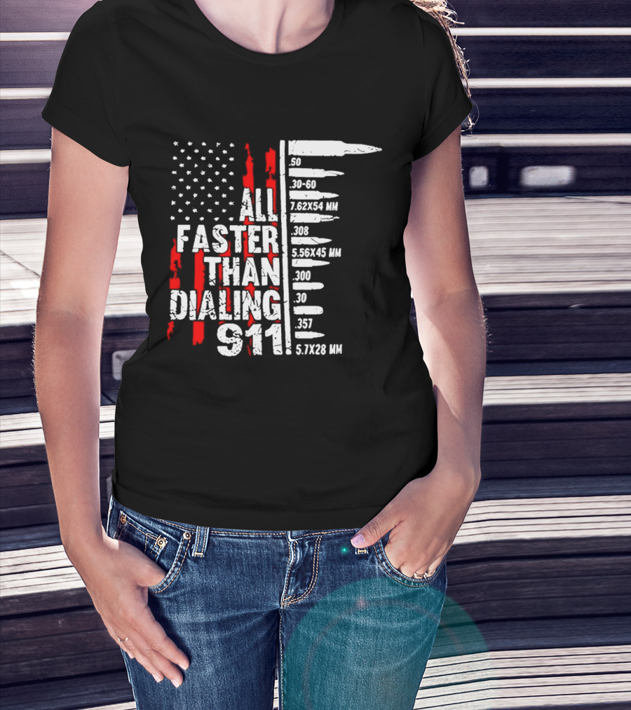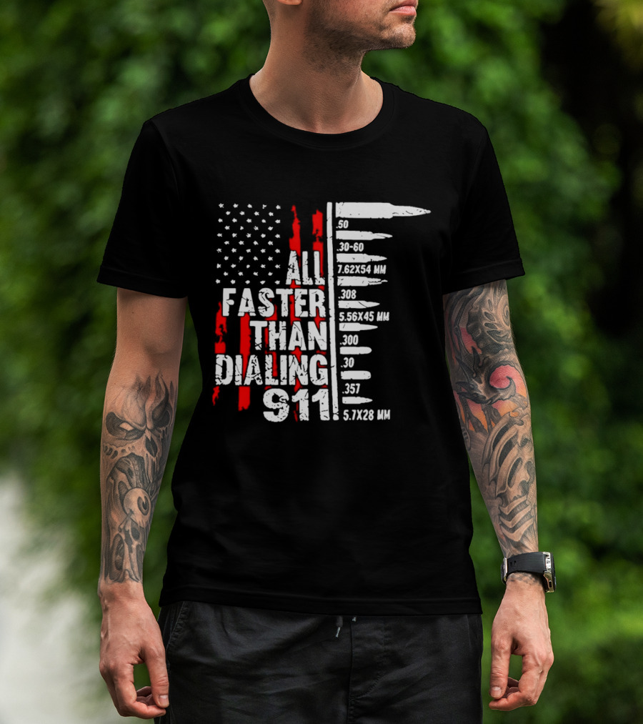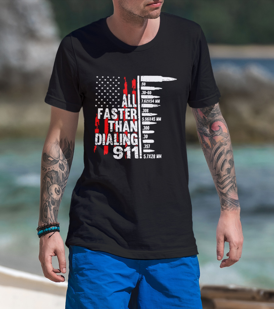 All Faster Than Dialing 911 Bullet Caliber List American Flag T-Shirt