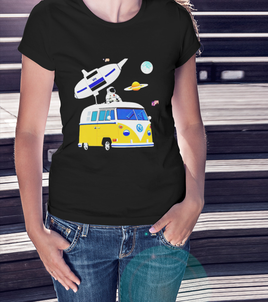 Astronaut Riding Yellow Volkswagen Bus With Rocket And Saturn Planet Background T-Shirt