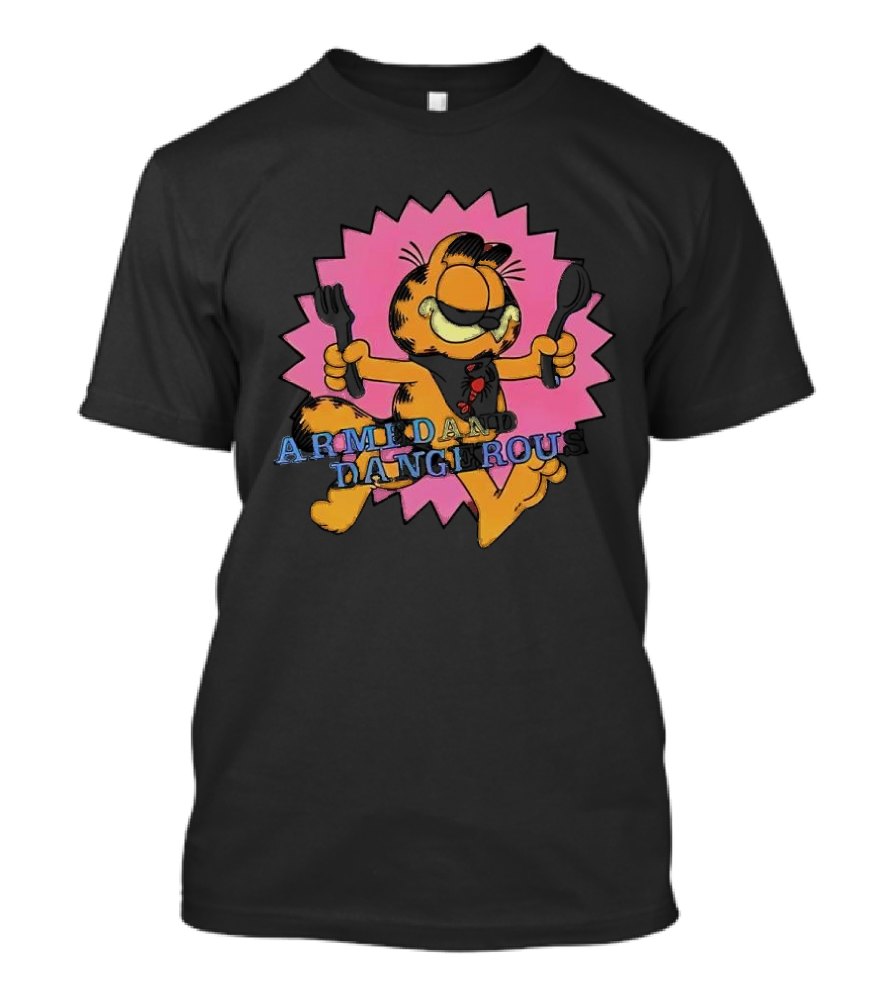 The Garfield Armed and Dangerous with Utensils Single Stitch T-shirt is designed for everyday wear and a consistent fit. Fabric is pre-shrunk ring-spun cotton with durable stitching. See the size chart below for exact measurements.