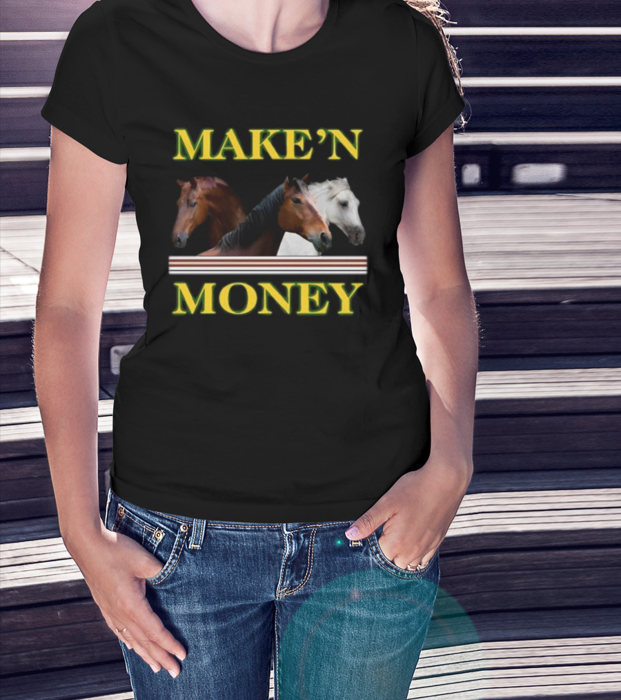 The MAKE'N MONEY Horse Trio T-shirt is designed for everyday wear and a consistent fit. Fabric is pre-shrunk ring-spun cotton with durable stitching. See the size chart below for exact measurements.