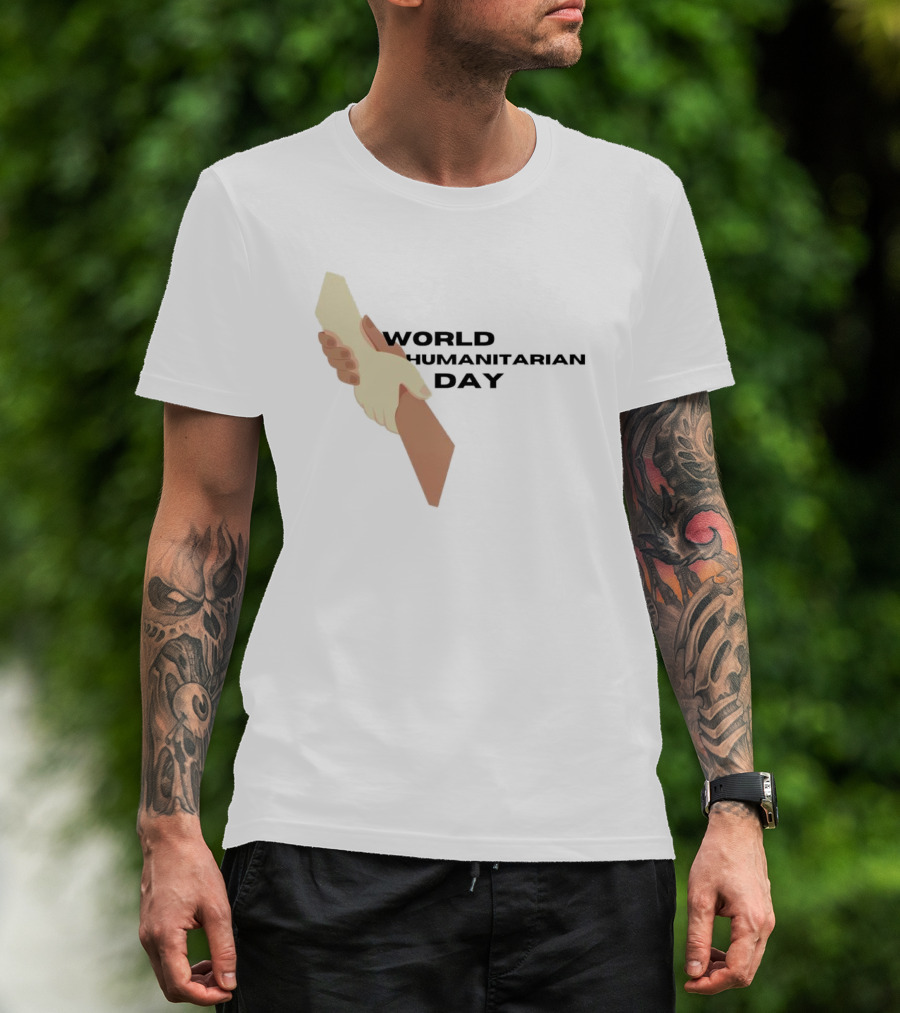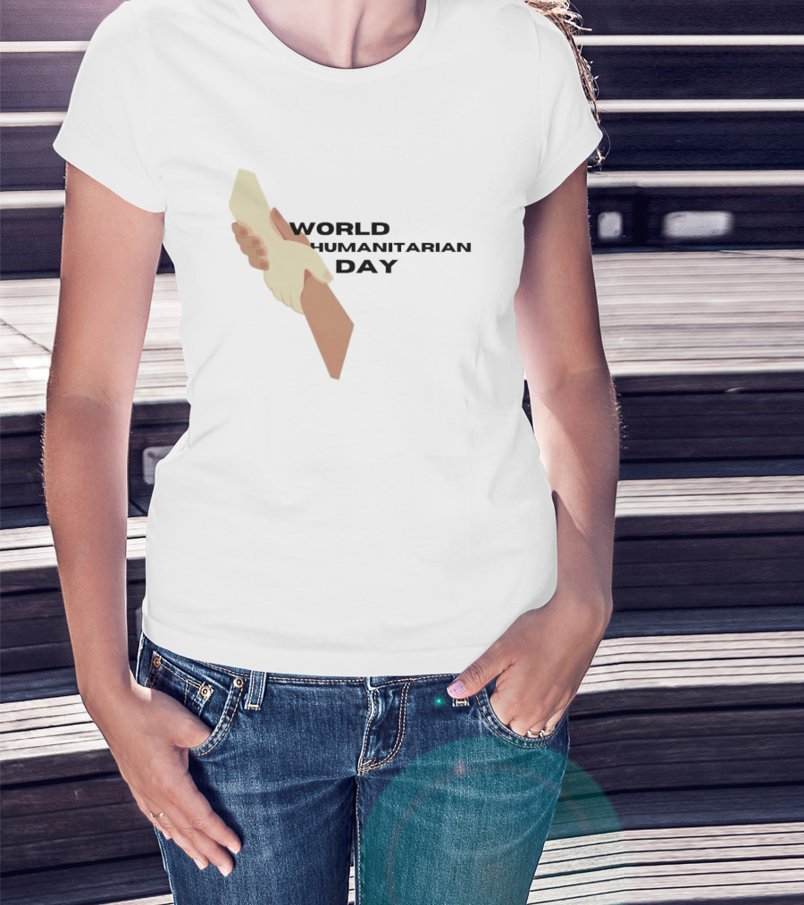 The World Humanitarian Day Shake Hands T-shirt is designed for everyday wear and a consistent fit. Fabric is pre-shrunk ring-spun cotton with durable stitching. See the size chart below for exact measurements.