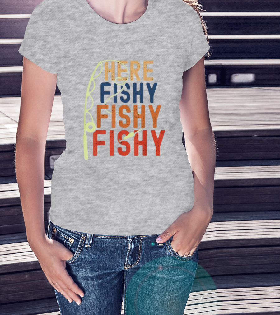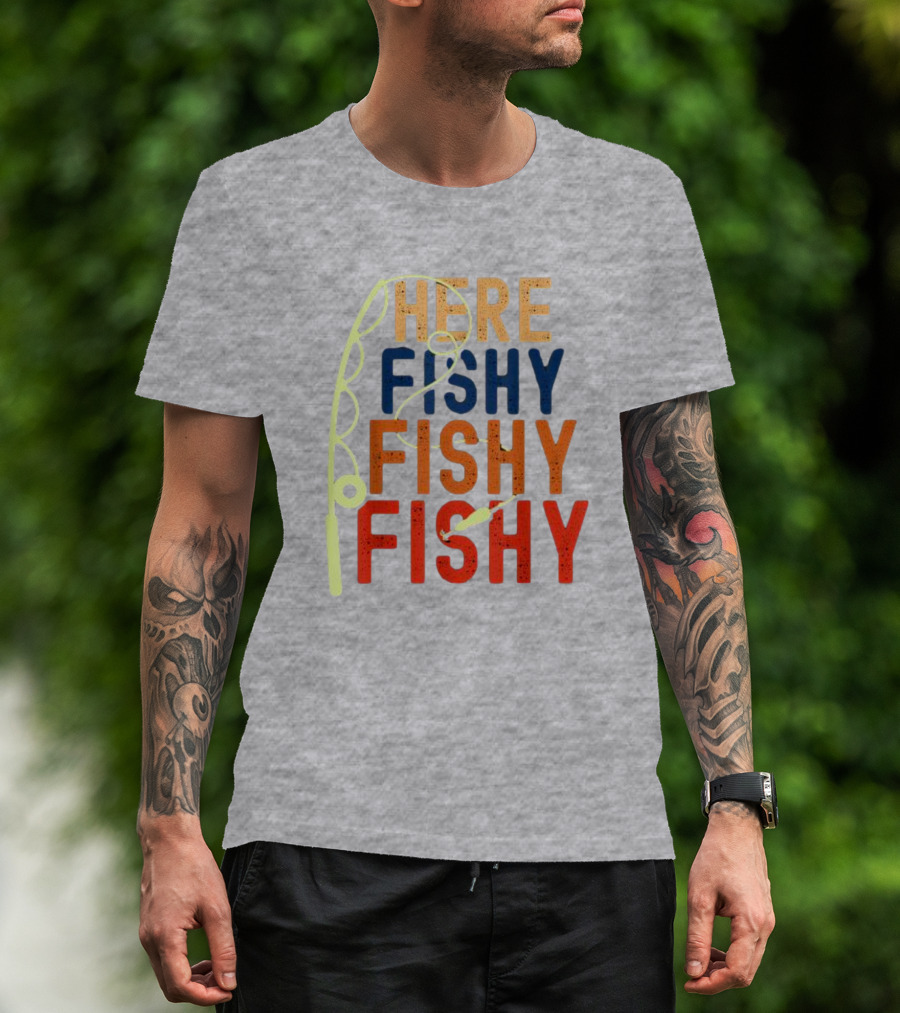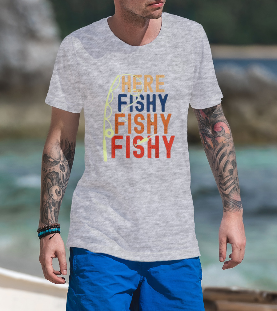The Here Fishy Fishy Fishy Fishing Rod T-shirt is designed for everyday wear and a consistent fit. Fabric is pre-shrunk ring-spun cotton with durable stitching. See the size chart below for exact measurements.