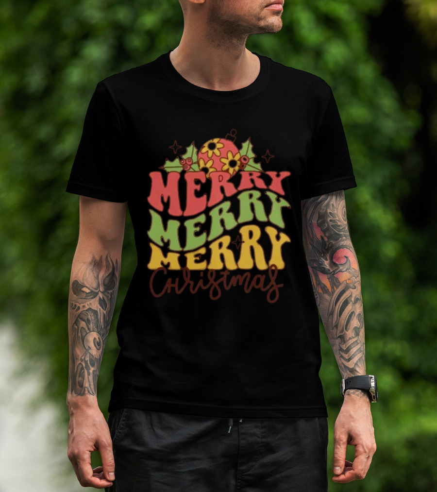 The Merry Merry Merry Christmas Retro Flowers and Holly T-shirt is designed for everyday wear and a consistent fit. Fabric is pre-shrunk ring-spun cotton with durable stitching. See the size chart below for exact measurements.