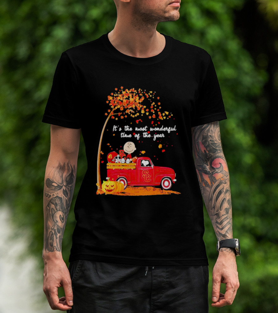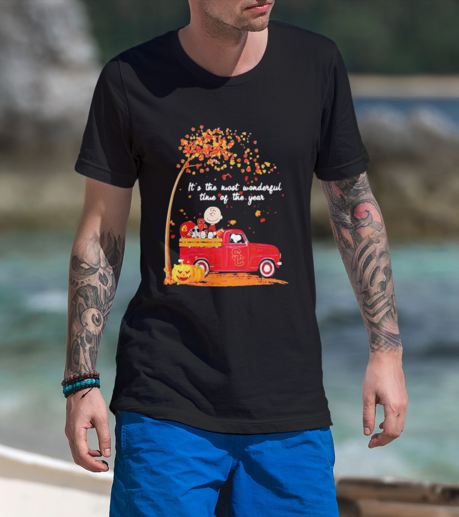 Peanuts Characters USC Trojans Fall It's The Most Wonderful Time Of The Year Football Truck Pumpkin Charlie Brown T-Shirt