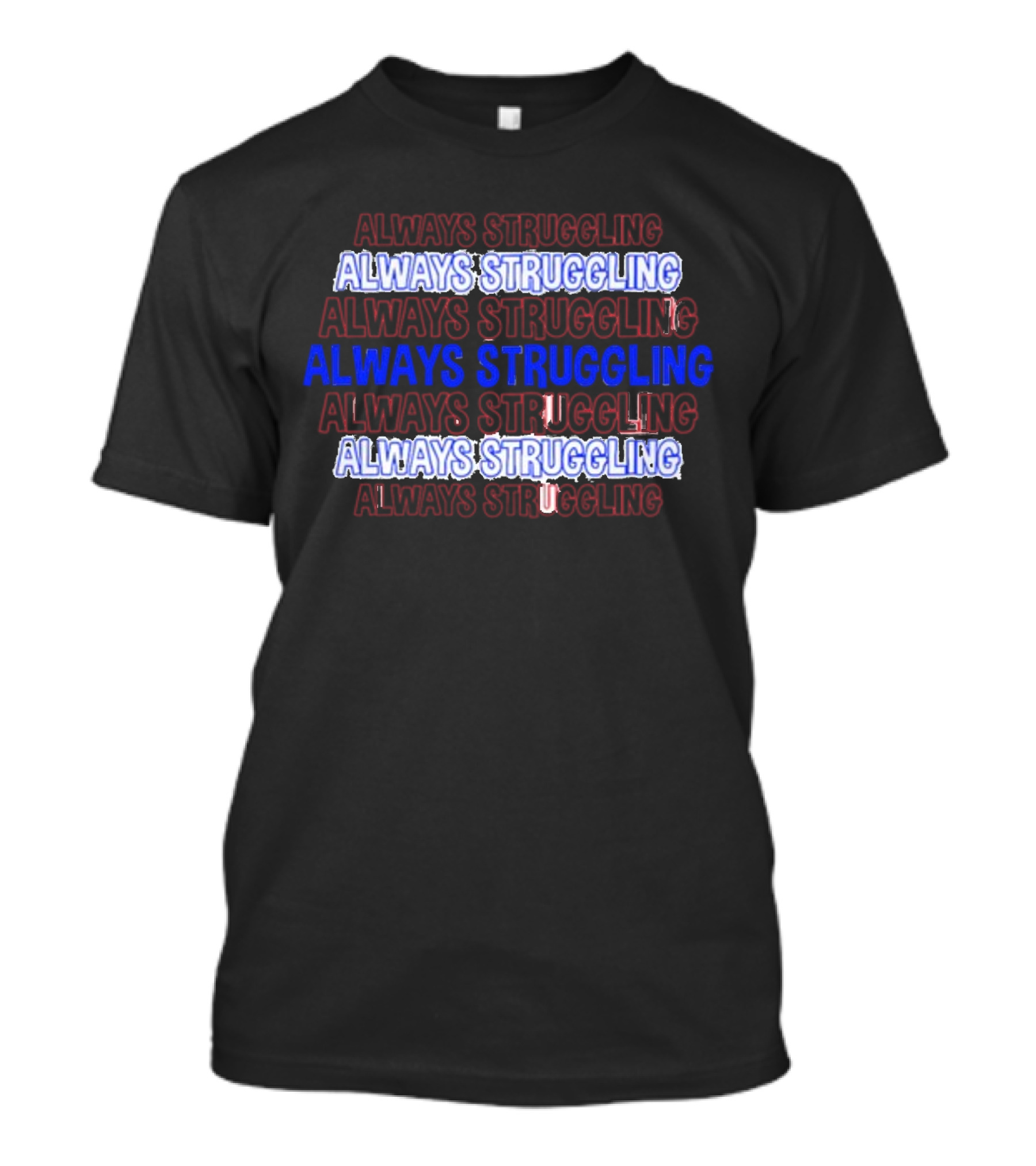 The ALWAYS STRUGGLING Repeated Multicolored Text T-shirt is designed for everyday wear and a consistent fit. Fabric is pre-shrunk ring-spun cotton with durable stitching. See the size chart below for exact measurements.