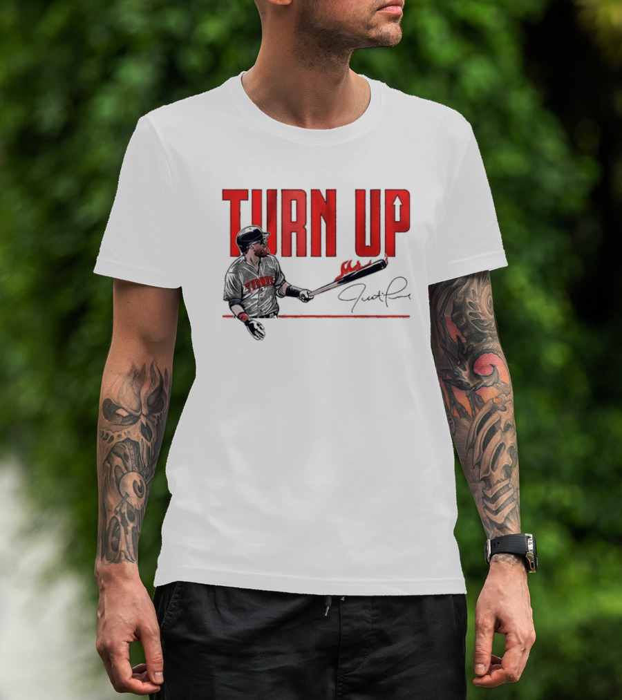 The Justin Turner Baseball Turn Up Fire Bat Signature T-shirt is designed for everyday wear and a consistent fit. Fabric is pre-shrunk ring-spun cotton with durable stitching. See the size chart below for exact measurements.