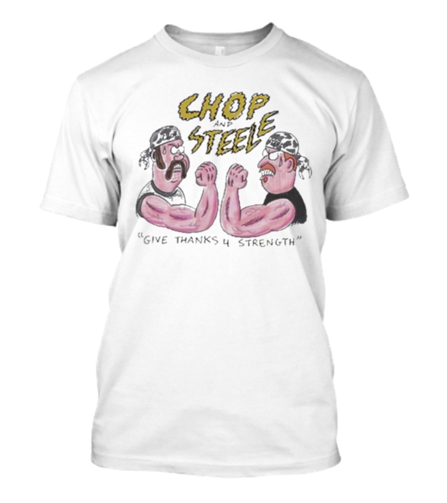 The Found Footage Fest Chop And Steele Give Thanks 4 Strength Arm Wrestling Cartoon T-shirt is designed for everyday wear and a consistent fit. Fabric is pre-shrunk ring-spun cotton with durable stitching. See the size chart below for exact measurements.
