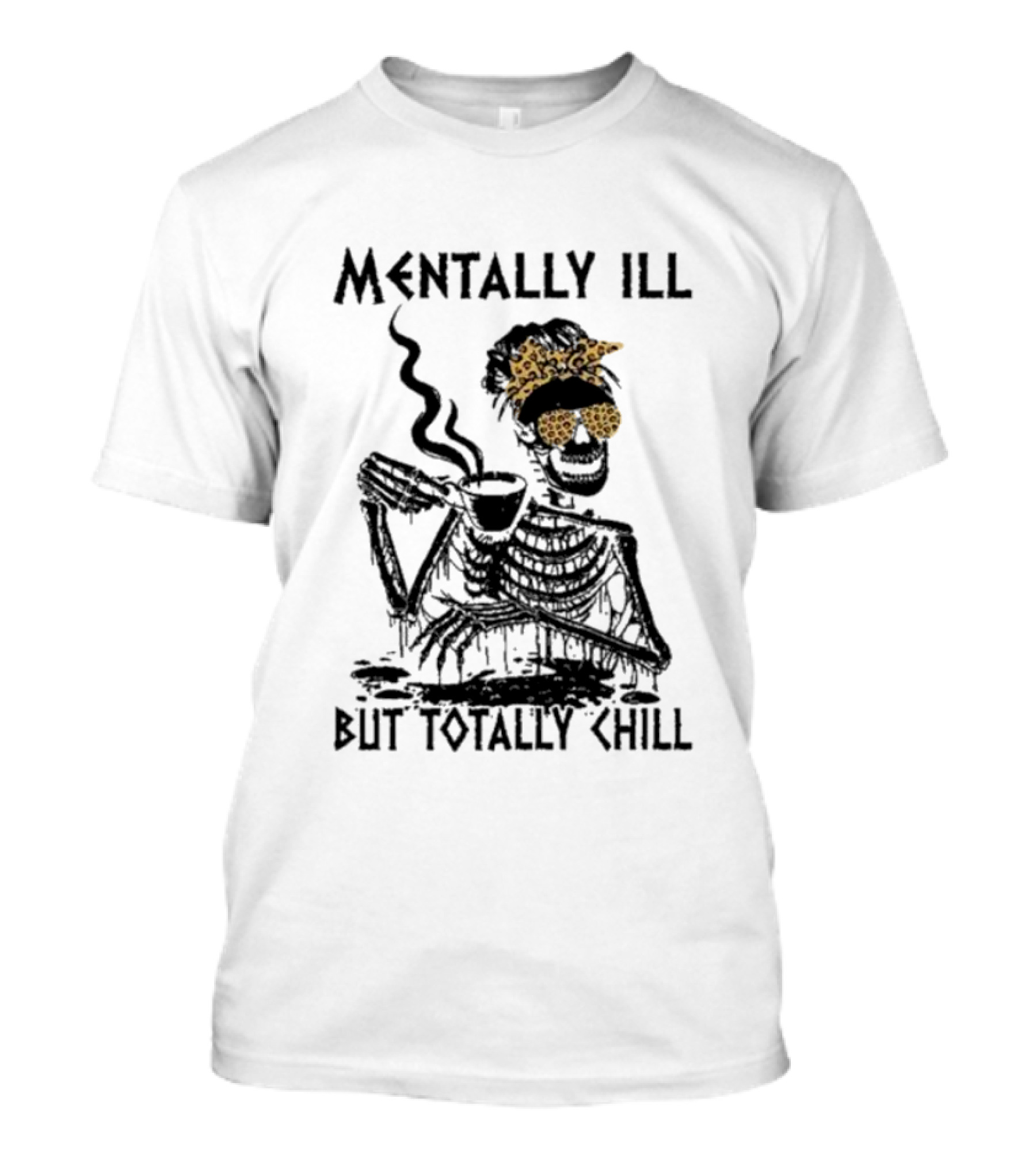 The Mentally Ill Halloween But Totally Chill Skeleton with Coffee and Leopard Print Accessories T-shirt is designed for everyday wear and a consistent fit. Fabric is pre-shrunk ring-spun cotton with durable stitching. See the size chart below for exact measurements.