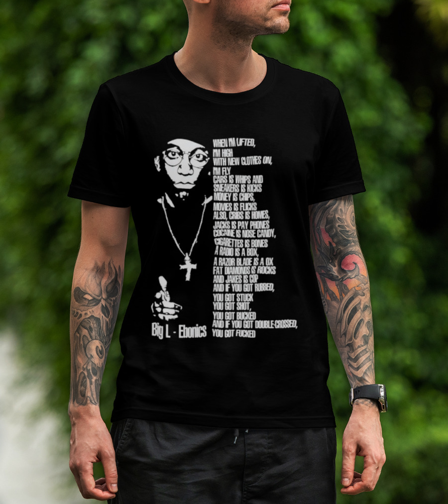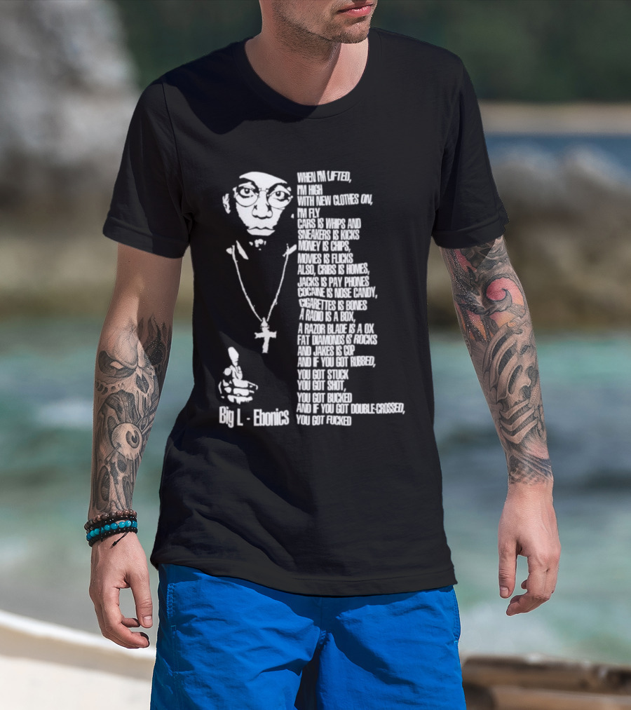 The Big L Ebonics Rap Lyrics T-shirt is designed for everyday wear and a consistent fit. Fabric is pre-shrunk ring-spun cotton with durable stitching. See the size chart below for exact measurements.