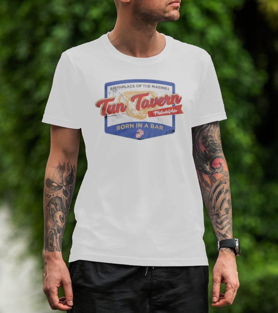The Birthplace of the Marines Tun Tavern Philadelphia Born in a Bar November 10 1775 T-shirt is designed for everyday wear and a consistent fit. Fabric is pre-shrunk ring-spun cotton with durable stitching. See the size chart below for exact measurements.