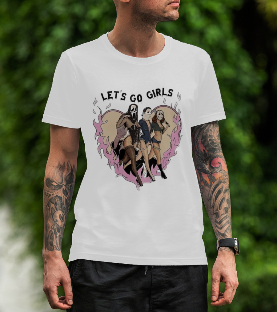 The Let's Go Girls Horror Serial Killer T-shirt is designed for everyday wear and a consistent fit. Fabric is pre-shrunk ring-spun cotton with durable stitching. See the size chart below for exact measurements.