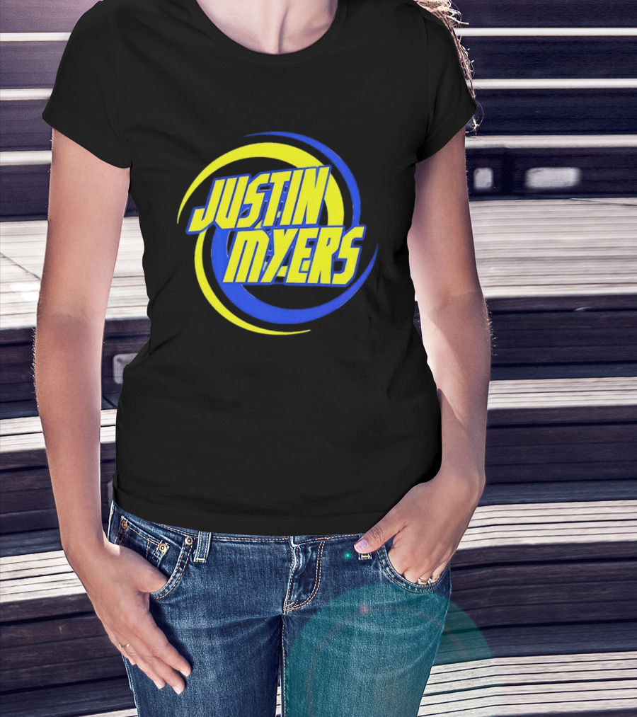 JUSTIN MYERS Blue Yellow Spiral Circle Text T-Shirt