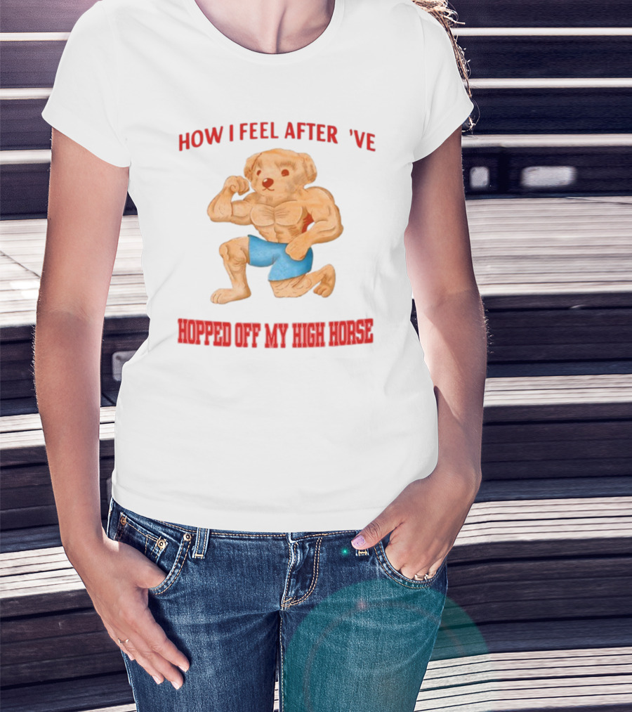 How I Feel After I've Hopped Off My High Horse Jmcgg Muscular Teddy Bear In Blue Shorts T-Shirt