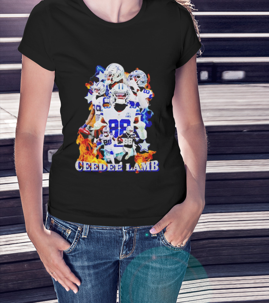 The CEEDDEE LAMB 88 Cowboys Fire Stars Collage T-shirt is designed for everyday wear and a consistent fit. Fabric is pre-shrunk ring-spun cotton with durable stitching. See the size chart below for exact measurements.
