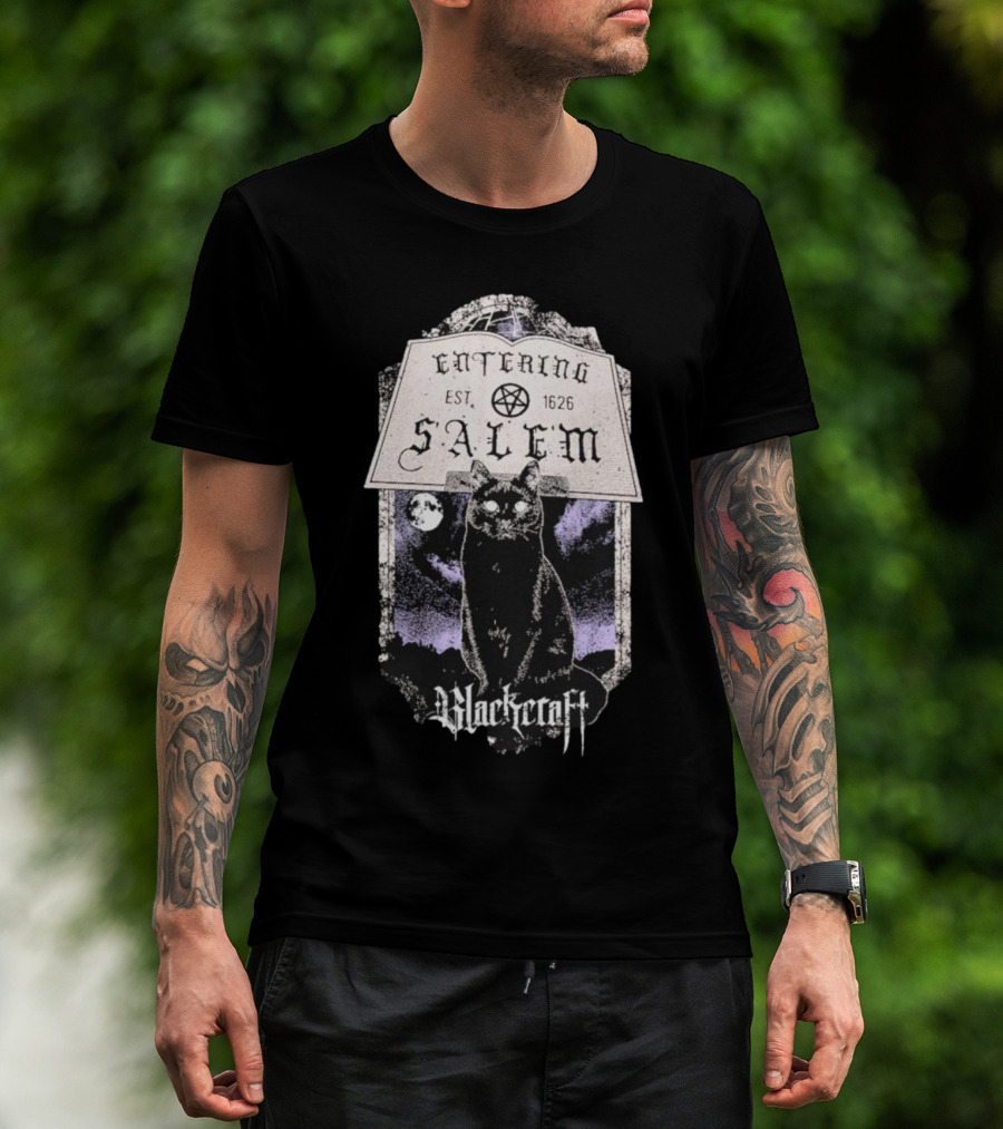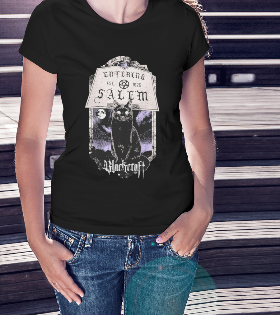 Blackcraft Cult Entering Salem Est. 1626 Black Cat And Crescent Moon Scene T-Shirt