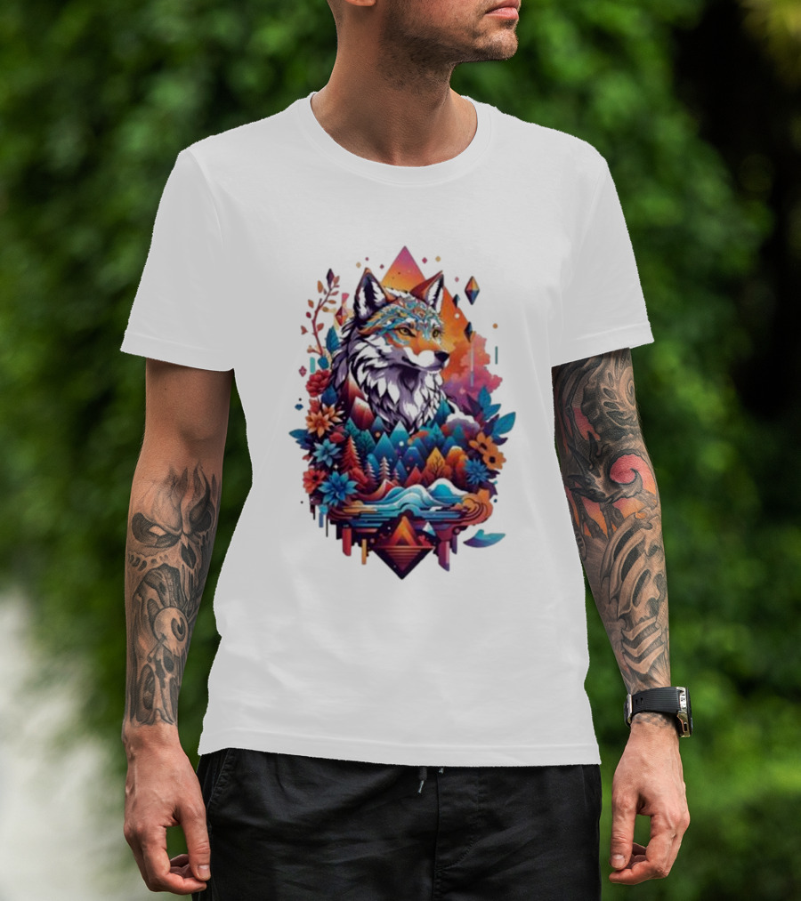 The Colorful Geometric Wolf with Mountains and Flowers T-shirt is designed for everyday wear and a consistent fit. Fabric is pre-shrunk ring-spun cotton with durable stitching. See the size chart below for exact measurements.