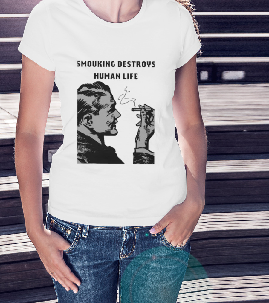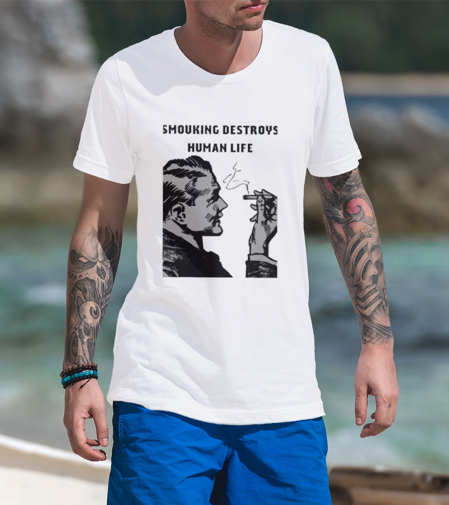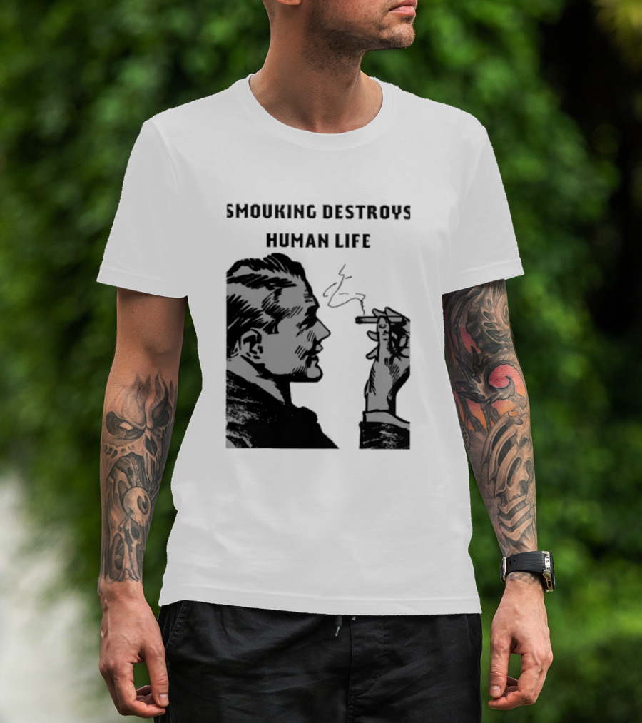 The Smouking Destroys Human Life T-shirt is designed for everyday wear and a consistent fit. Fabric is pre-shrunk ring-spun cotton with durable stitching. See the size chart below for exact measurements.