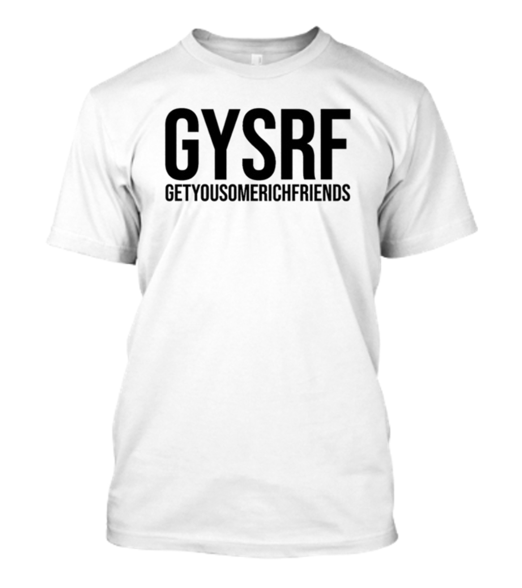 The GYSRF Getyousomerichfriends T-shirt is designed for everyday wear and a consistent fit. Fabric is pre-shrunk ring-spun cotton with durable stitching. See the size chart below for exact measurements.