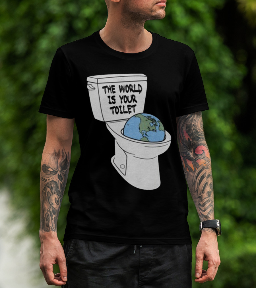 The Shitheadsteve Store The World Is Your Toilet Earth in Toilet Bowl T-shirt is designed for everyday wear and a consistent fit. Fabric is pre-shrunk ring-spun cotton with durable stitching. See the size chart below for exact measurements.