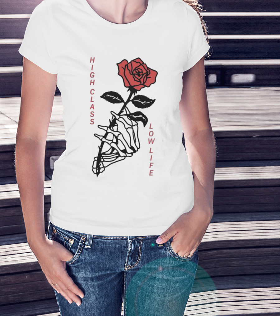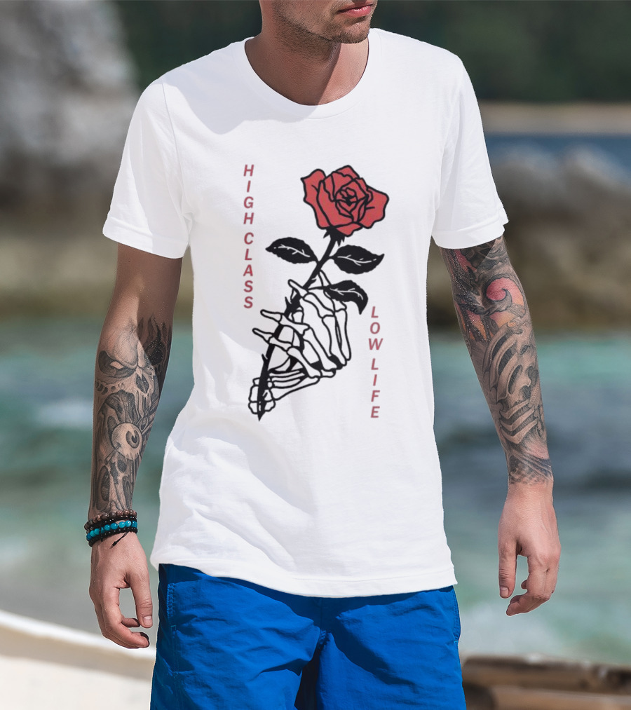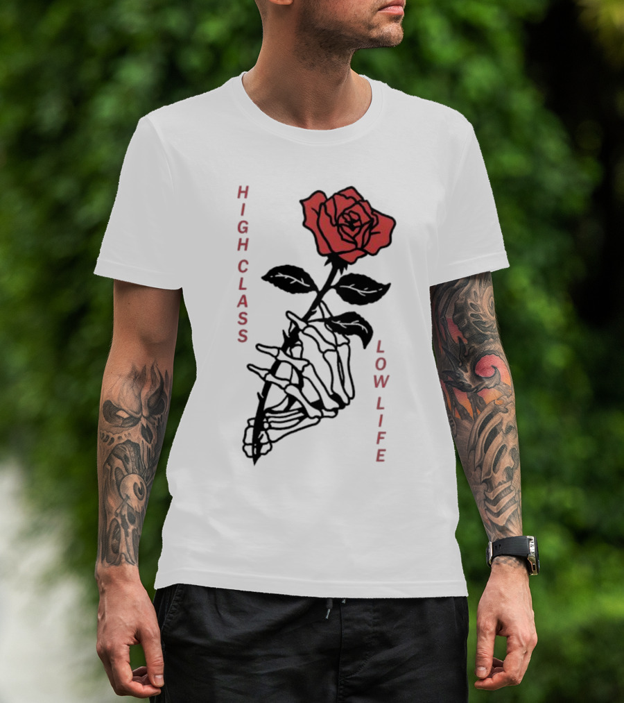 The HIGH CLASS LOW LIFE Rose Skeleton T-shirt is designed for everyday wear and a consistent fit. Fabric is pre-shrunk ring-spun cotton with durable stitching. See the size chart below for exact measurements.
