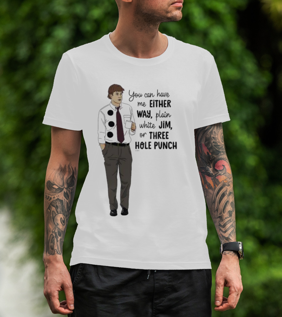 The You Can Have Me Either Way Plain White Jim Or Three Hole Punch Halloween T-shirt is designed for everyday wear and a consistent fit. Fabric is pre-shrunk ring-spun cotton with durable stitching. See the size chart below for exact measurements.