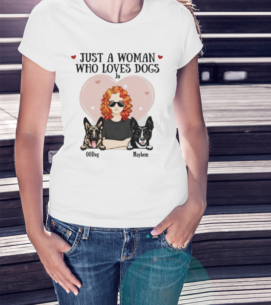 Just A Woman Who Loves Dogs Jo 00Dog Mayhem Titianred63 T-Shirt
