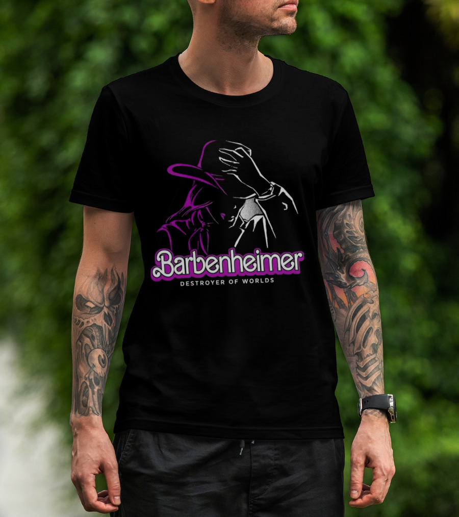 The Barbenheimer Destroyer of Worlds Shadowed Figure with Hat T-shirt is designed for everyday wear and a consistent fit. Fabric is pre-shrunk ring-spun cotton with durable stitching. See the size chart below for exact measurements.