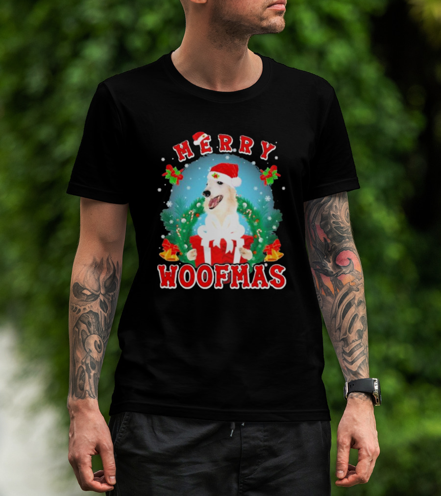 Merry Woofmas Borzoi Dog Santa Hat Christmas Wreath Snowflakes T-Shirt