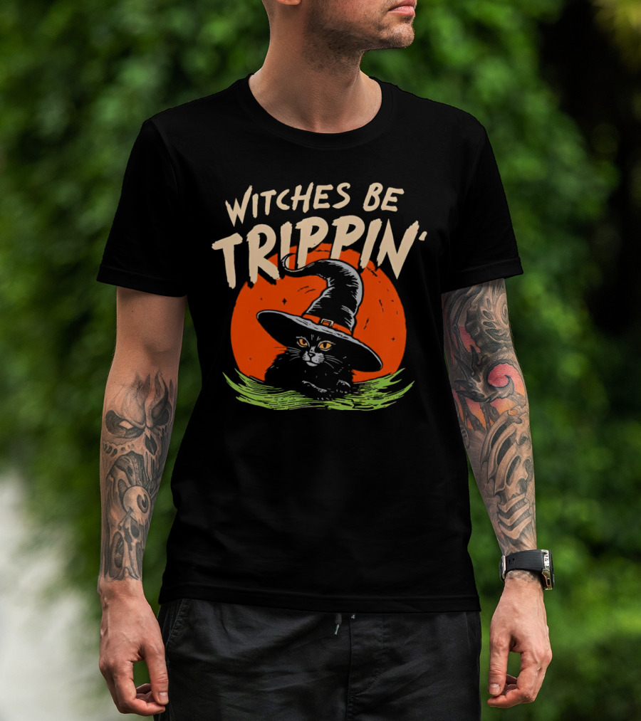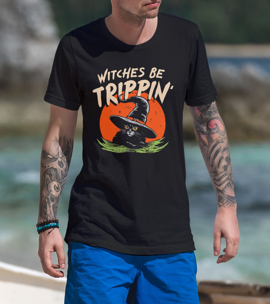 Witches Be Trippin’ Cat With Witch Hat And Red Moon Halloween T-Shirt