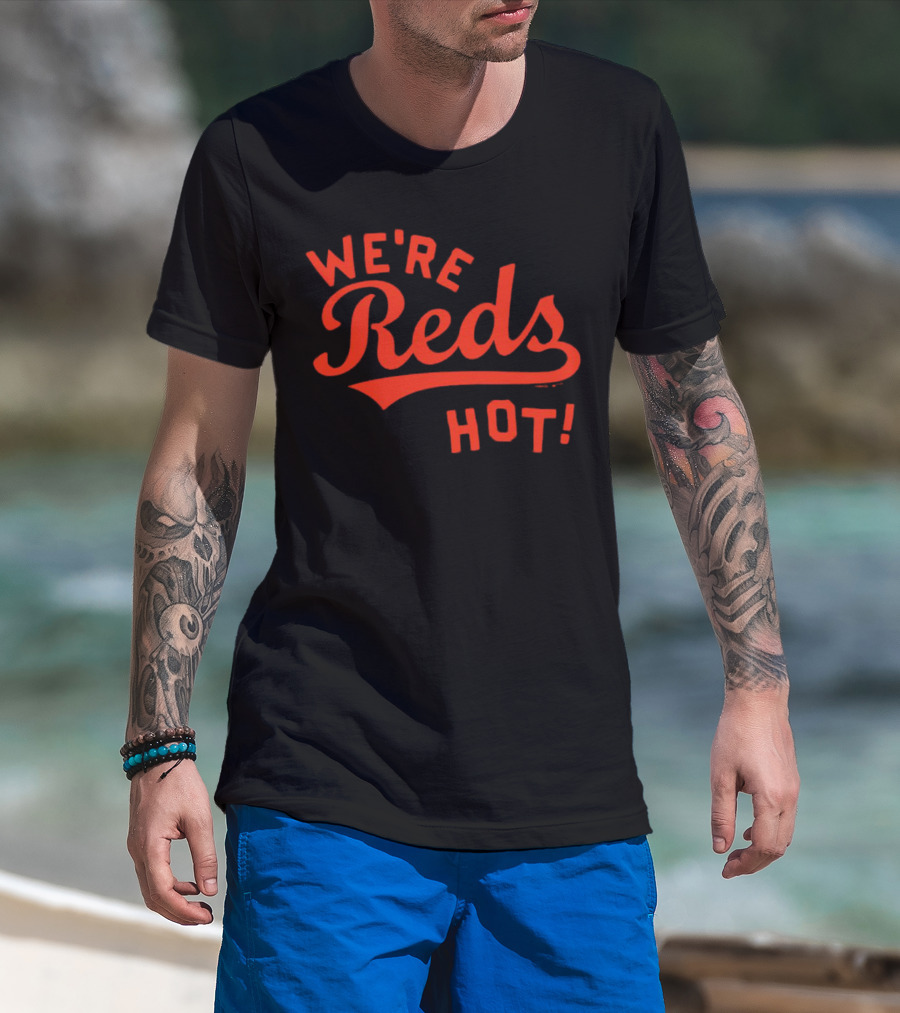 The Cincinnati Reds We're Reds Hot T-shirt is designed for everyday wear and a consistent fit. Fabric is pre-shrunk ring-spun cotton with durable stitching. See the size chart below for exact measurements.