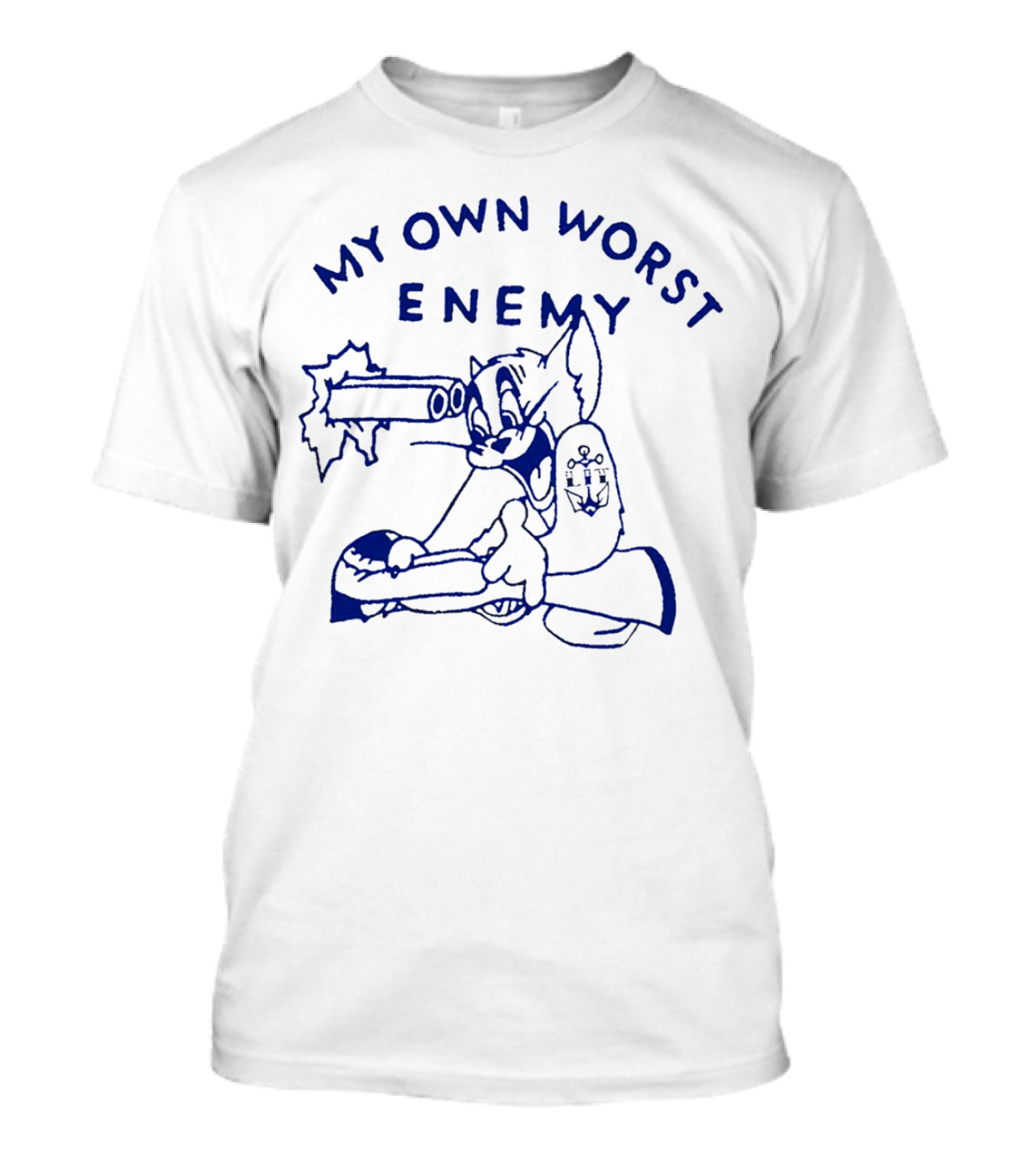 The My Own Worst Enemy Cartoon Character with Gun Blowing Up T-shirt is designed for everyday wear and a consistent fit. Fabric is pre-shrunk ring-spun cotton with durable stitching. See the size chart below for exact measurements.