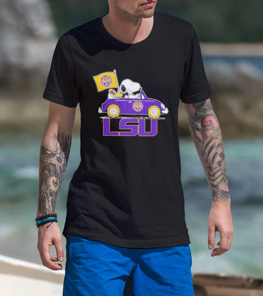 Snoopy And Woodstock Driving Purple LSU Car With Flag T-Shirt
